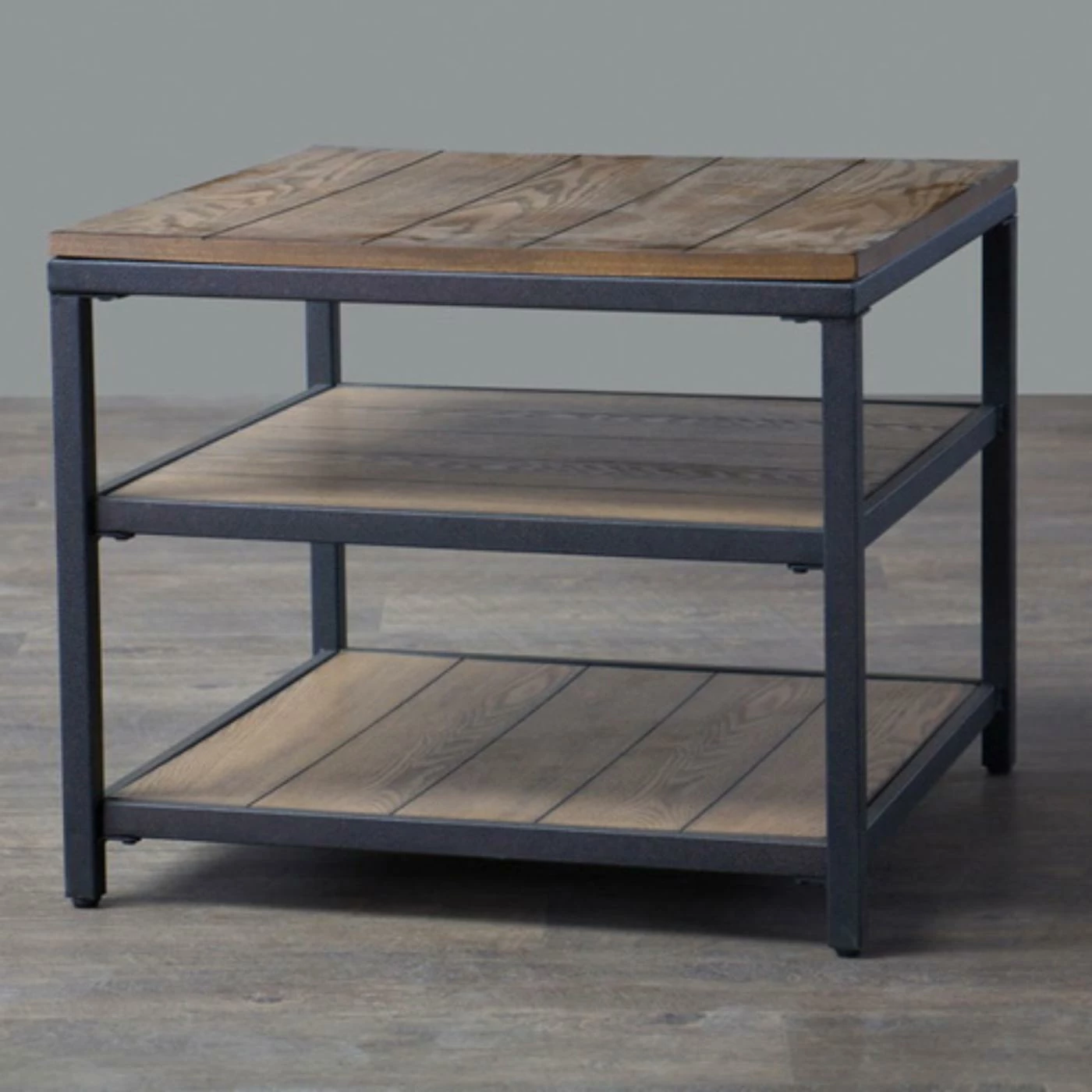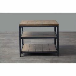 Go industrial chic in your living room with the Baxton Studio Caribou End Table. This three-level end table features a heavy-duty iron frame with a rusted bronze finish for an aged look. To enhance the timeworn vibe of the piece, the engineered wood top and lower display shelves show off a distressed ash veneer finish.
