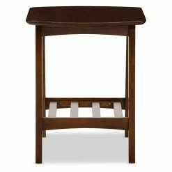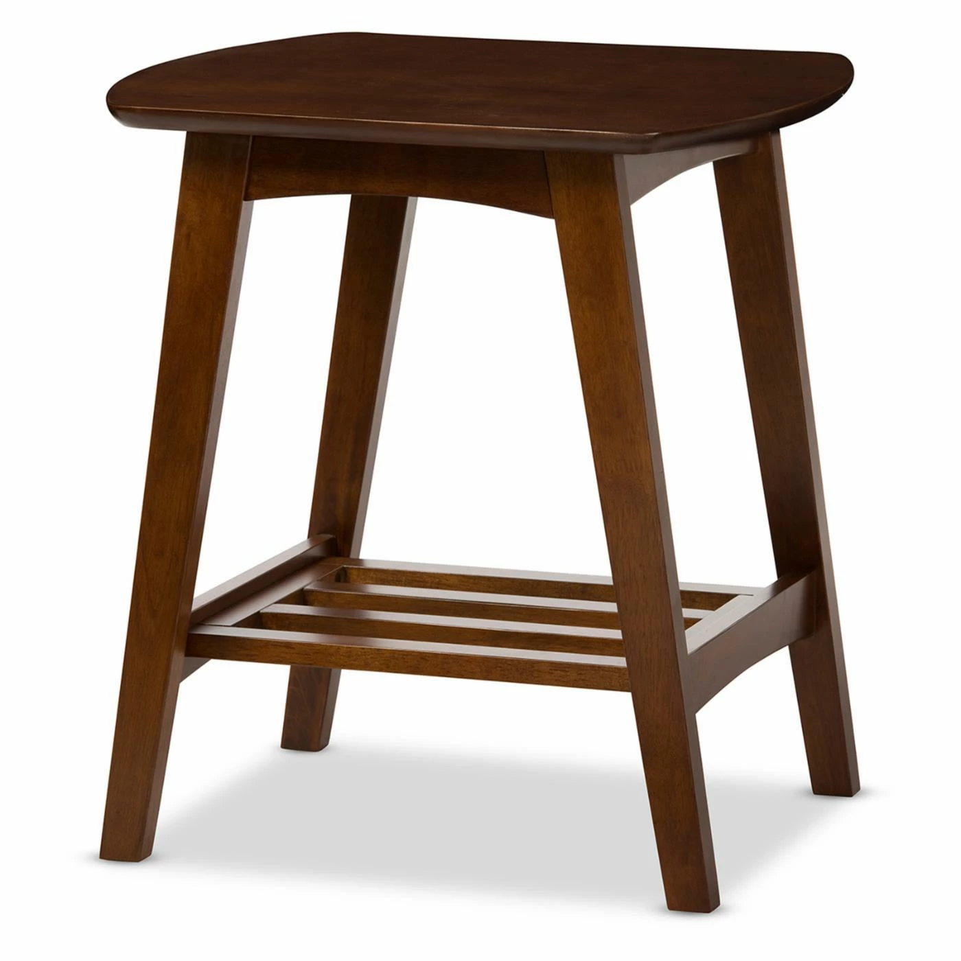 Pairing an oval tabletop with angled, straight legs, the Baxton Studio Sacramento End Table captures the sleek, clean styling of classic Scandinavian style. The table is built to stand the test of time out of solid rubber wood and engineered wood. Its walnut veneers bring warm organic color to a room. You can keep items stored on the slatted shelf below and expand your storage possibilities with the coordinating console and coffee tables, sold separately.