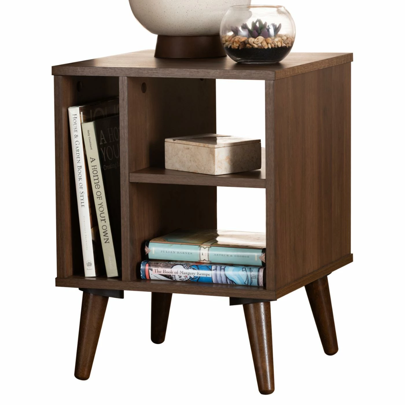 Whether you need to organize your bedroom or living room, the Baxton Studio Sami Mid-Century Modern Wood End Table is the perfect option. Three shelves and a spacious top will hold your books, decorative items, and a lamp. The open shelf design and tapered feet add to the mid-century modern style. This end table is constructed from particle board, rubberwood, and polyurethane in a walnut finish.
