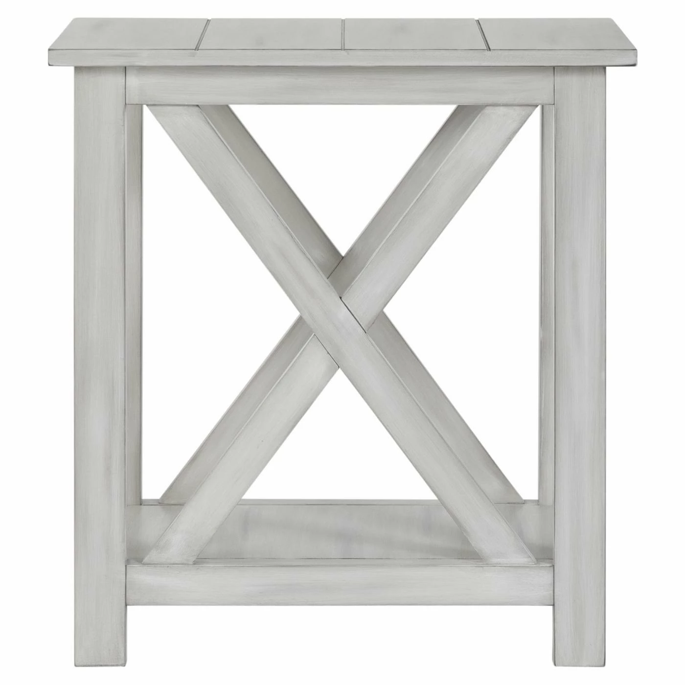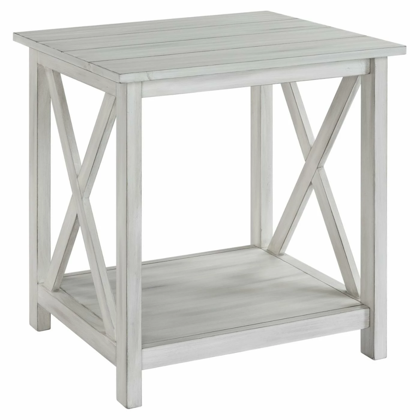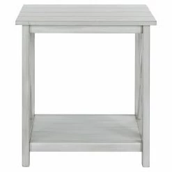 Rustic trellis detailing lends the Boraam Jamestown Square End Table vintage farmhouse style. This sturdy end table boasts strong engineered and solid wood design. A white washed finish adds to the antique look. The lower shelf provides room for books or dΓ©cor.