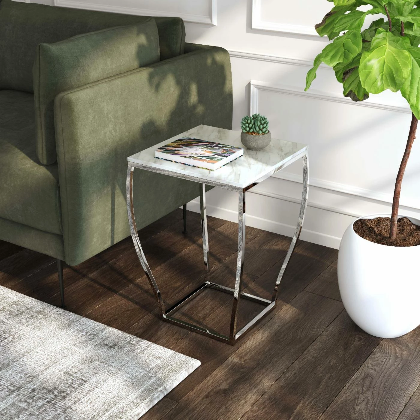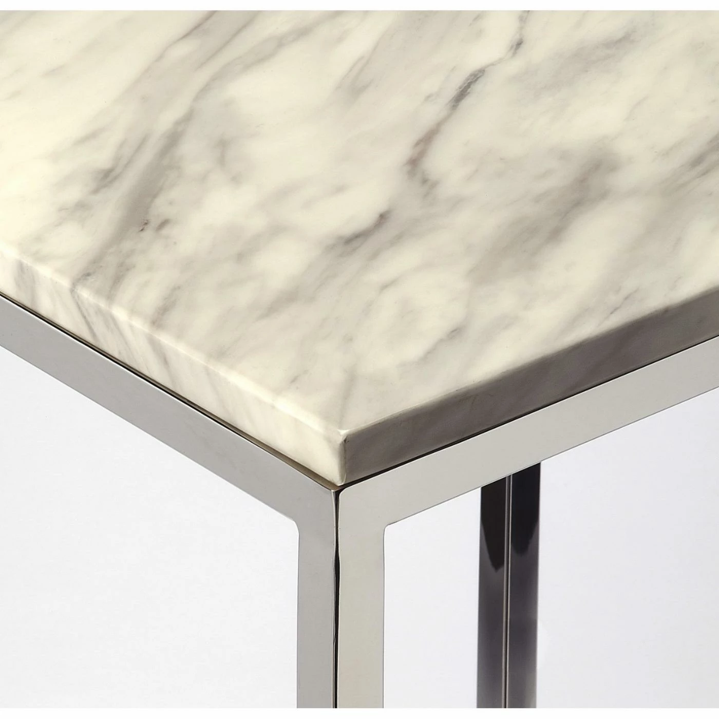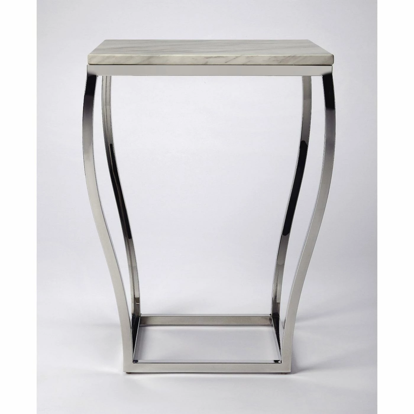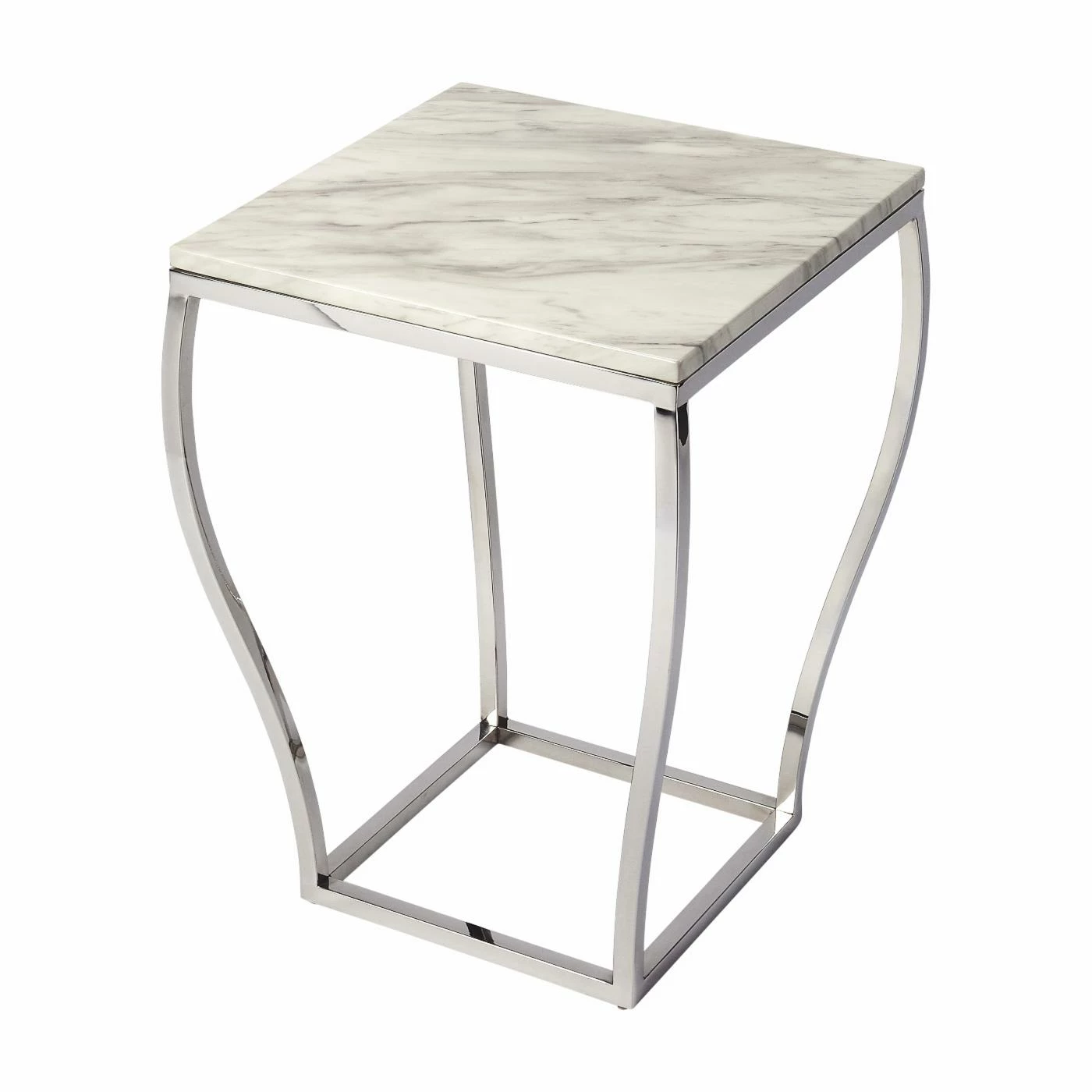 Put a new spin on your home decorations with the Butler Specialty Haley Marble and Metal End Table. This end table is made from stainless steel with a marble tabletop. The white slab features natural mineral veins in soft gray. The silver legs on this table curve to the smaller square base for a unique look that’s perfect for more compact space. Some assembly is required before putting this accent table in your favorite room and putting a lamp, coasters, or your favorite photograph on top.