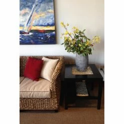 Create a sophisticated, coastal atmosphere with the Chic Teak Java Side Table. The top and shelf are texture-rich with woven banana leaves in a natural beige hue. These woven insets are protected with a five-step polyurethane finish thatβs glossy and moisture-resistant. Solid mahogany wood in a rich walnut finish forms the frame.