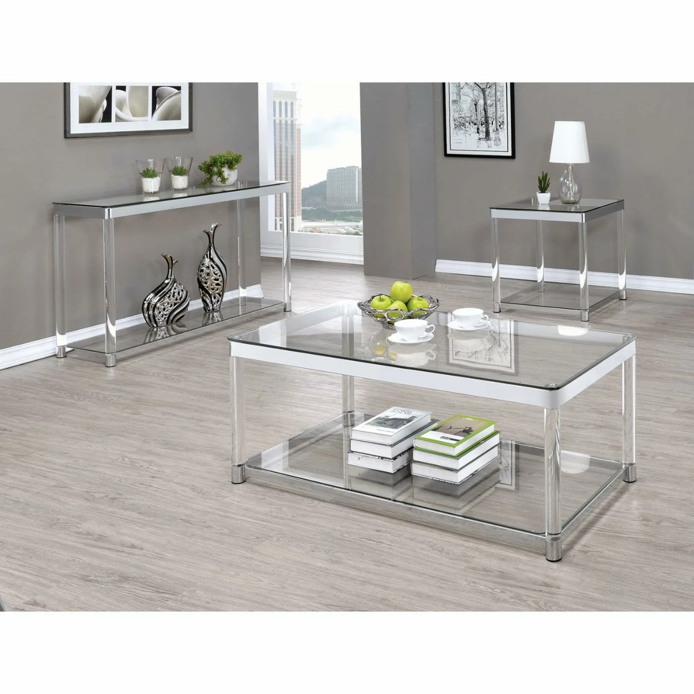 Tubular acrylic legs lend a levitating look to Coaster Furniture Square Glass Top End Table – Chrome. Flaunting a sleek, square design, this light and airy end table includes a five millimeter thick clear glass top and lower shelf for plenty of display and storage space. Subtly accented in chrome for a touch of shine, this chic table delivers glamour and elegance to your home’s decor