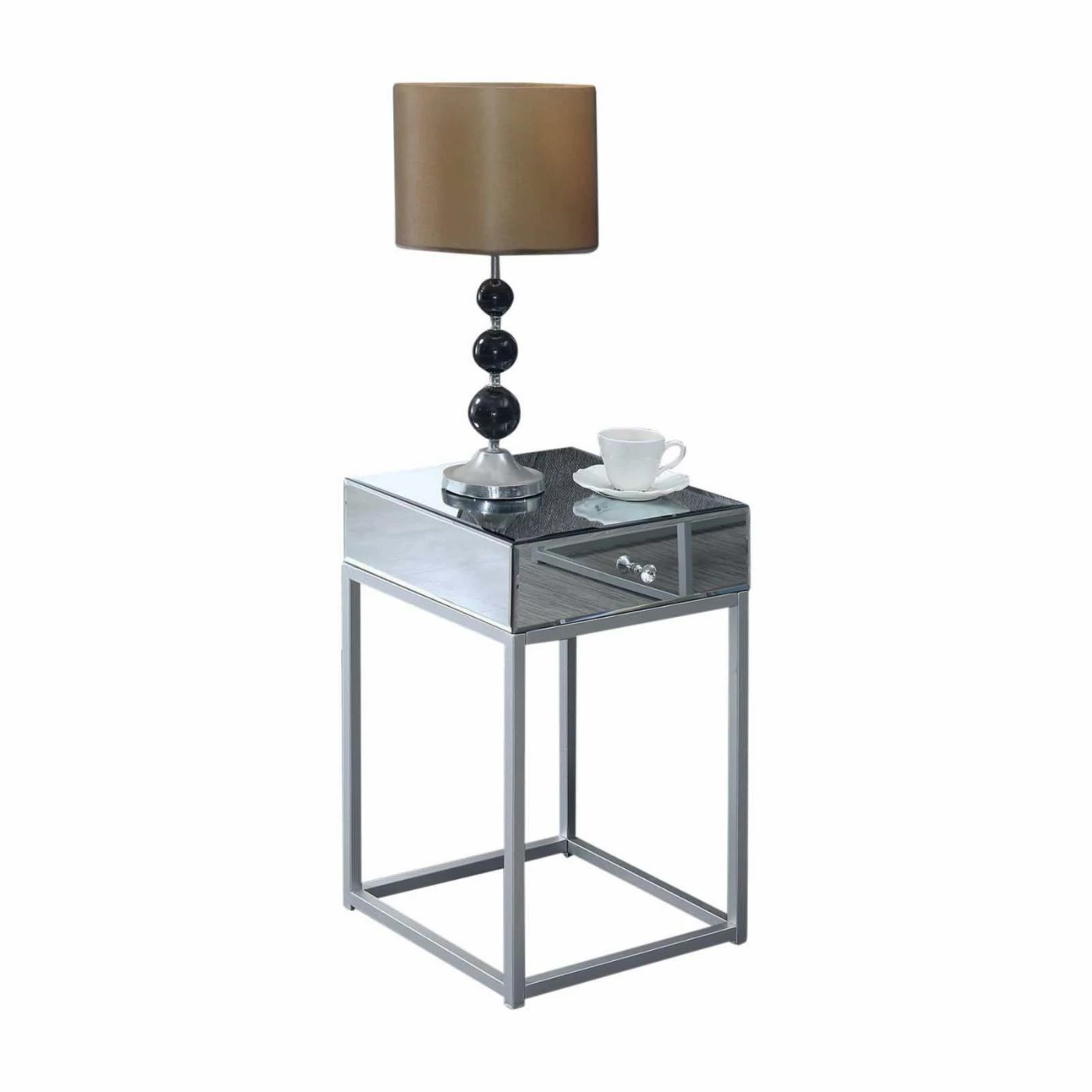 Decorate the spacious top of the Convenience Concepts Reflections End Table with a uniquely designed lamp and geometric sphere to add to the glam style. The mirrored glass box top has a single drawer with a faux crystal knob that solidifies the design. The connecting metal base has a matte gray finish that allows the glass to stand out.