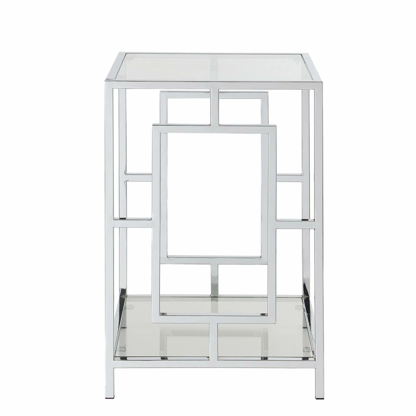 Usher in a new modern look that pops with the Convenience Concepts Town Square End Table. This square end table comes crafted from squared metal with block feet. The sides have an open design with a floating square look. Dazzling polished chrome finishes the piece. Both the tabletop and lower shelf are rendered from thick, clear tempered glass.