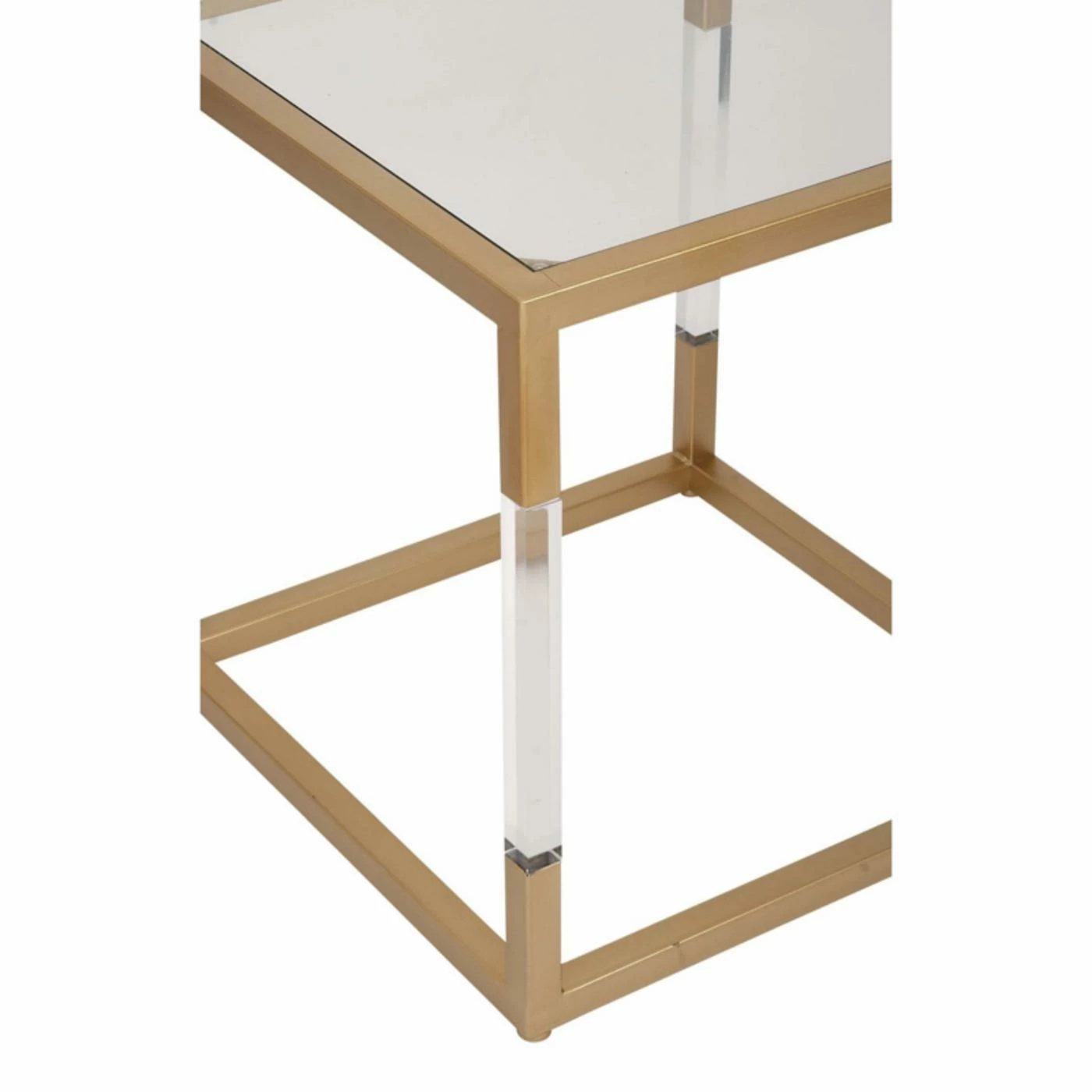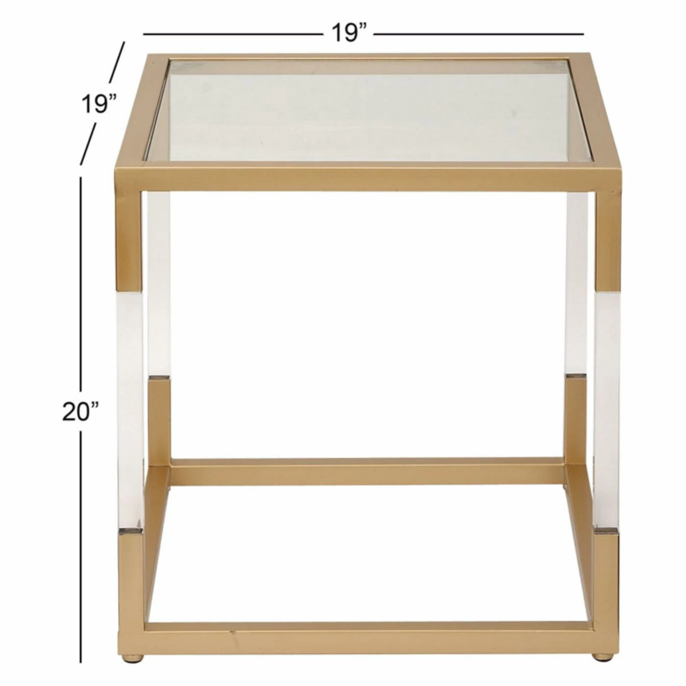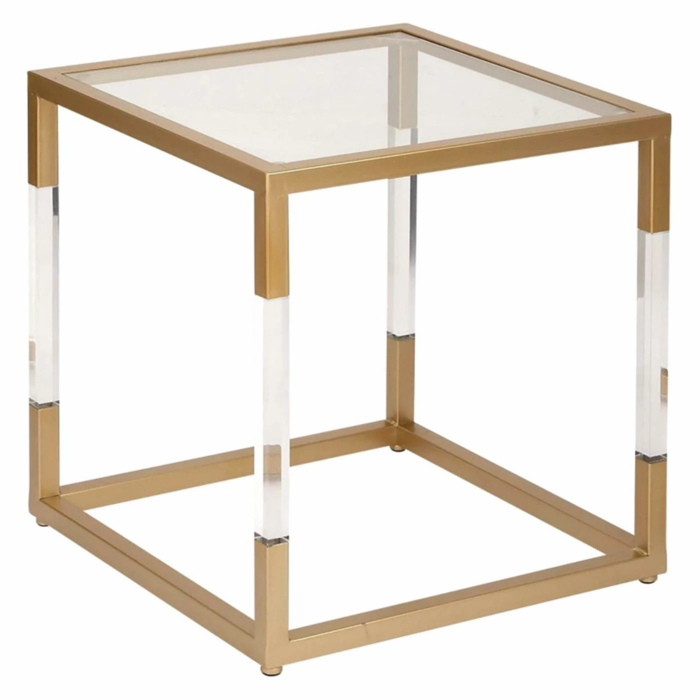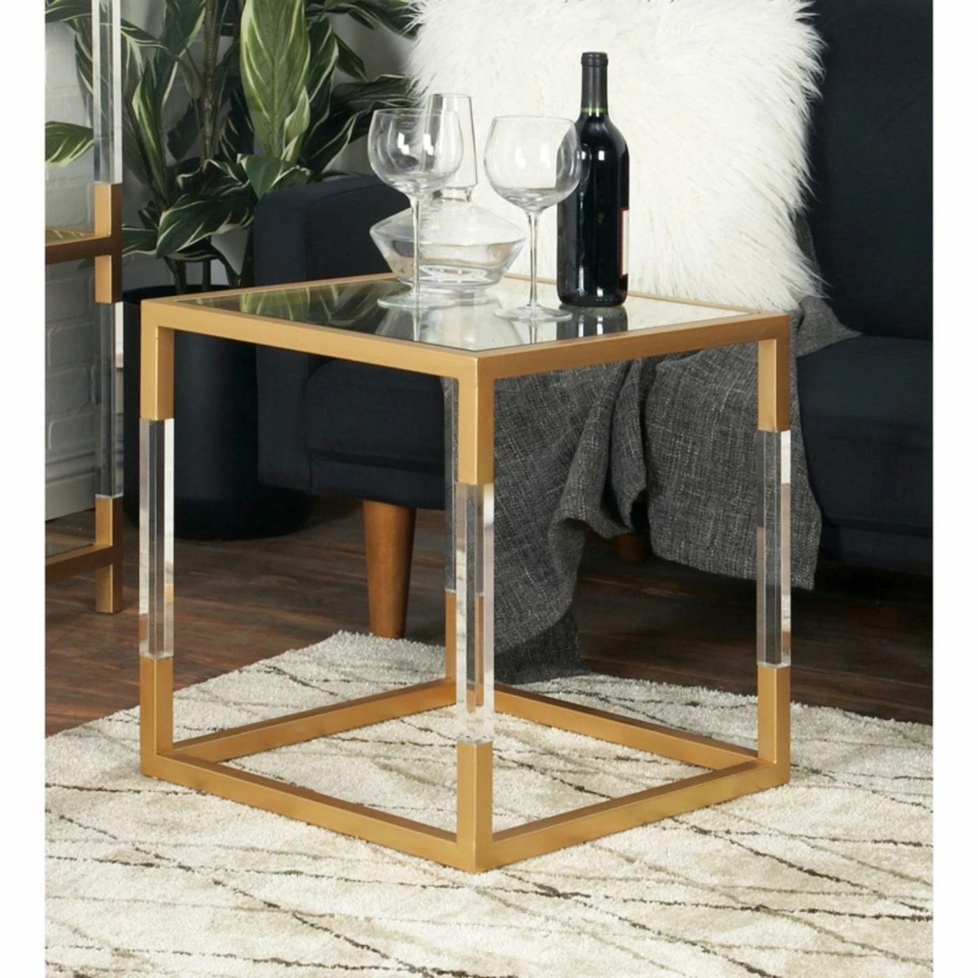 The decidedly contemporary DecMode Glass and Acrylic End Table features an open cube base made of iron and accented with clear acrylic and a glamorous gold finish. The end table is crowned with a clear glass top so you can see the details from all angles.
