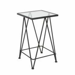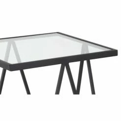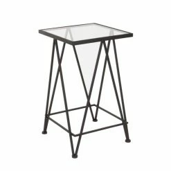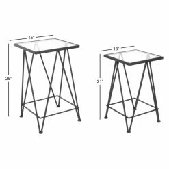 Perfect in your living space, the DecMode Metal Tables – Set of 2 includes one larger and one smaller table. Each table features a clear glass top and iron framework in matte black finish.