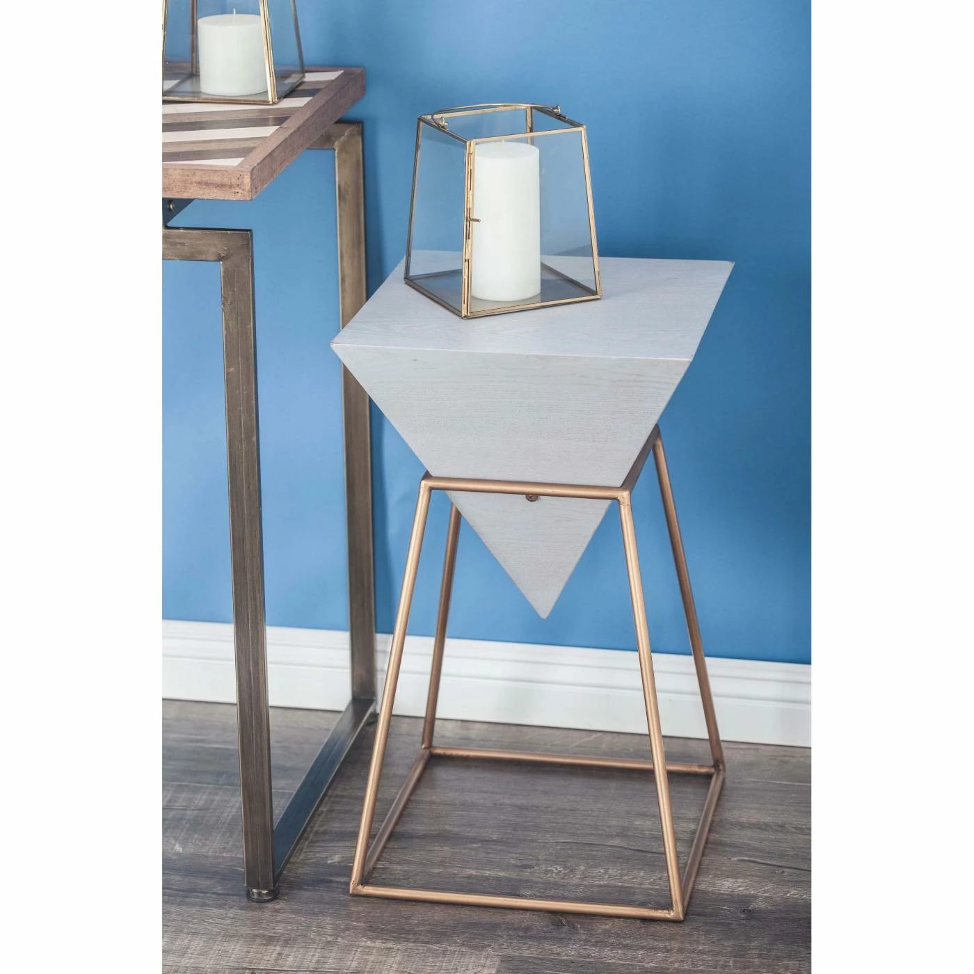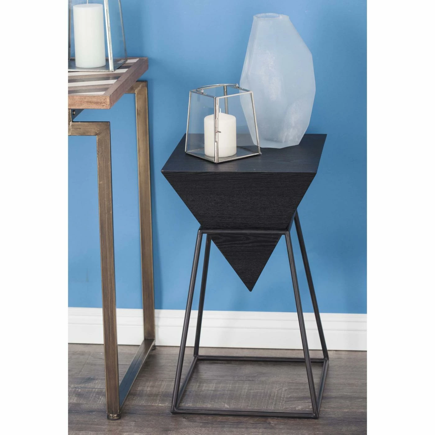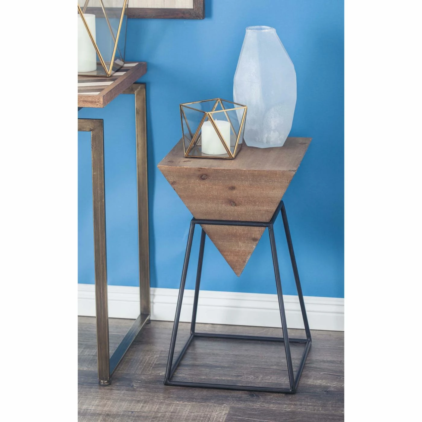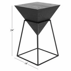 Clean geometric lines create the DecMode Modern Inverted Pyramid Accent Table’s chic contemporary style. This accent table features a top crafted of strong fir, ash and engineered woods. Its inverted pyramid shape is supported by a sturdy iron base.