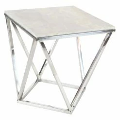 Gleaming silver-toned finishing accents the elegant geometric base of the DecMode Modern Marble Accent End Table. This contemporary table features a strong base of stainless steel and is topped by luxurious white marble.