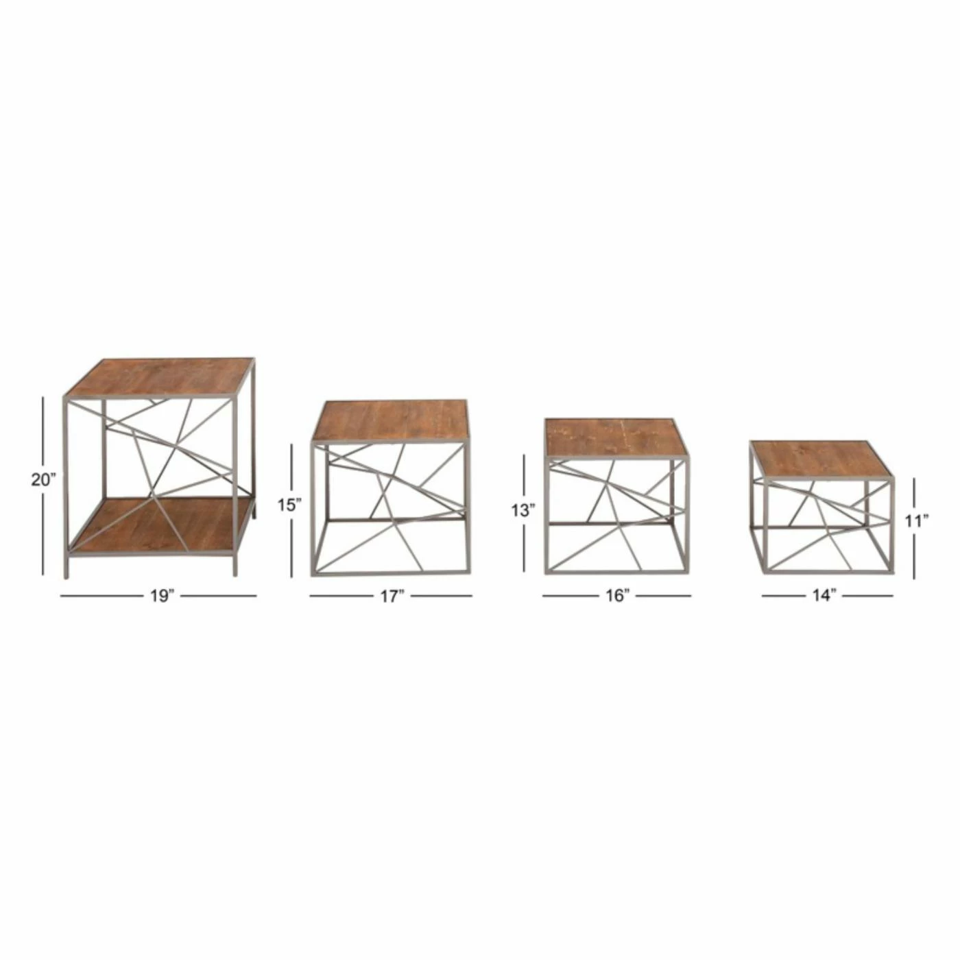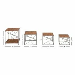 Get all of the tables you need in your living space with the DecMode Square End Table – Set of 4. This set includes four contemporary end tables with sturdy brown-finished fir wood tops and gray iron bases with diagonal wire accents. A lower fir wood shelf is featured beneath the top of the largest table.