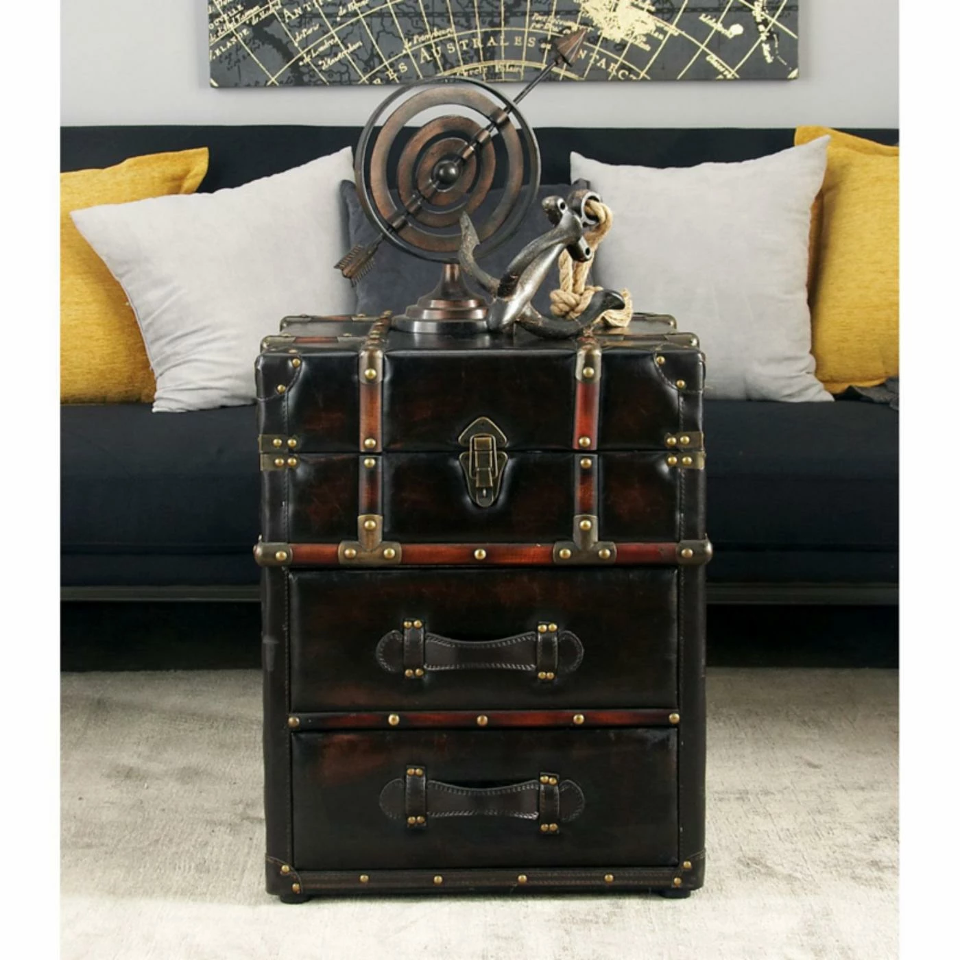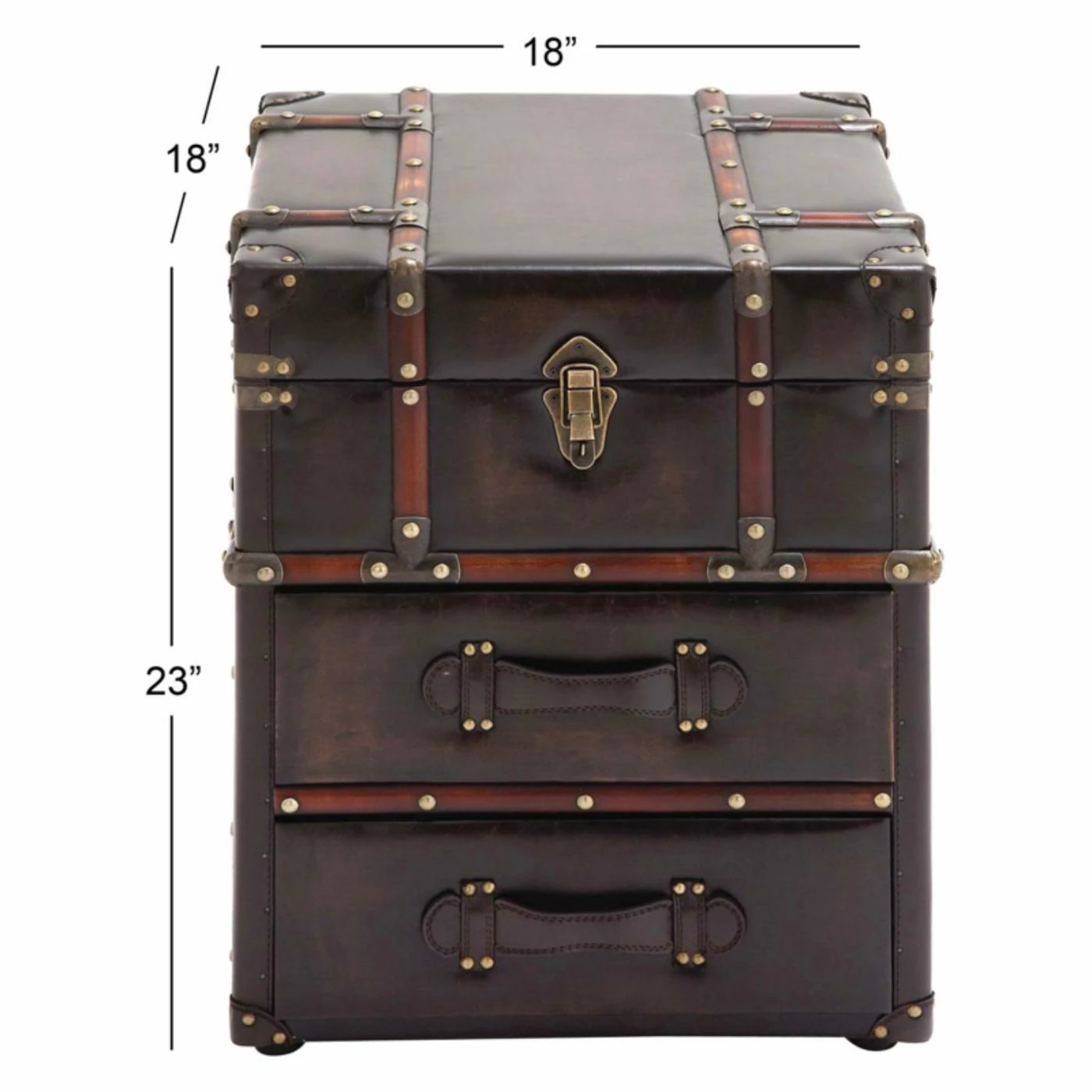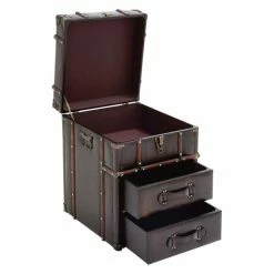 The DecMode Trunk End Table with Drawers adds a travel theme and smart storage for the living room or library. The vintage trunk design is upholstered in brown faux leather with espresso-finished wood strips and brass nail heads. The top lifts for storage and the two drawers have leatherette strap handles.