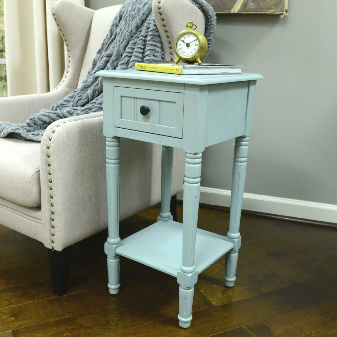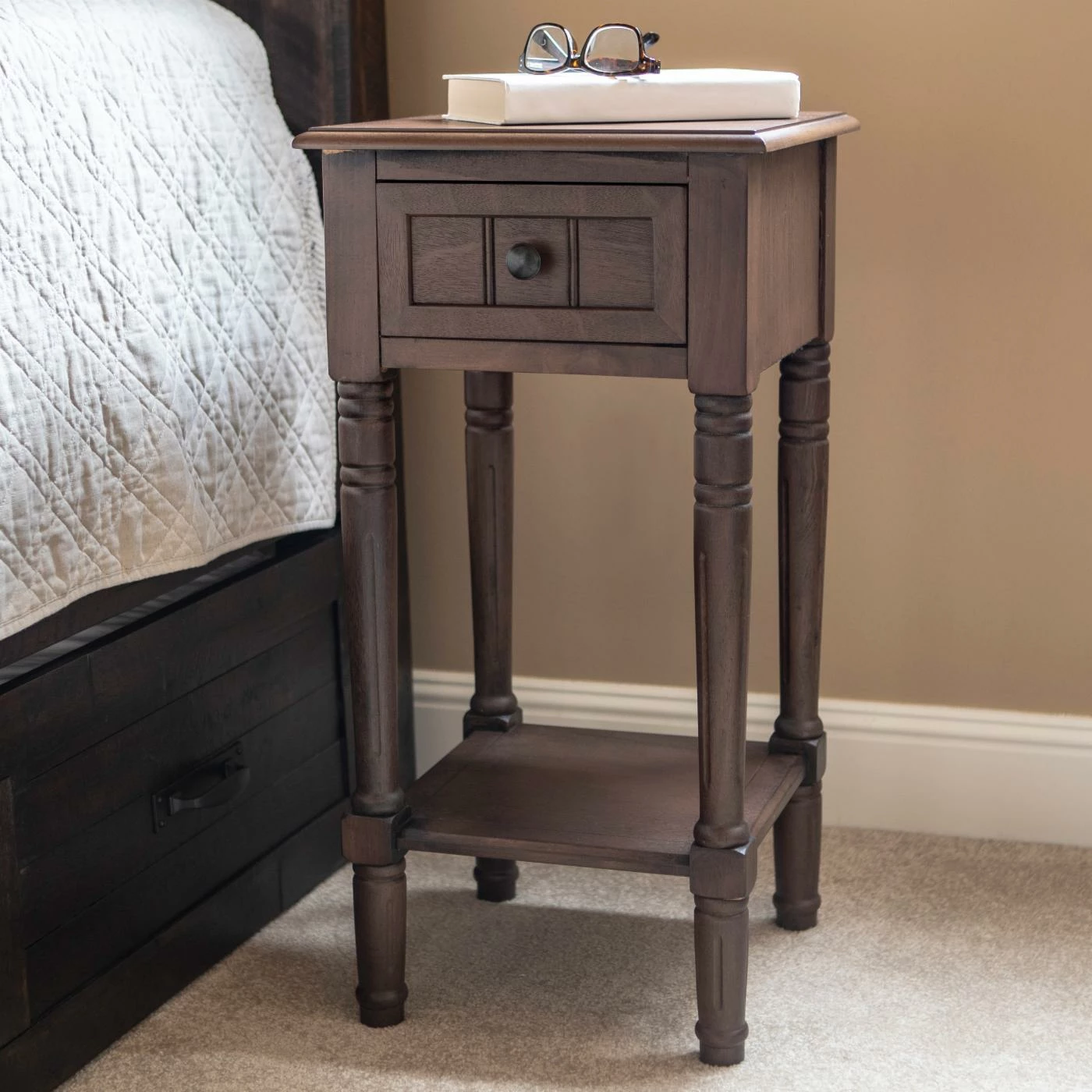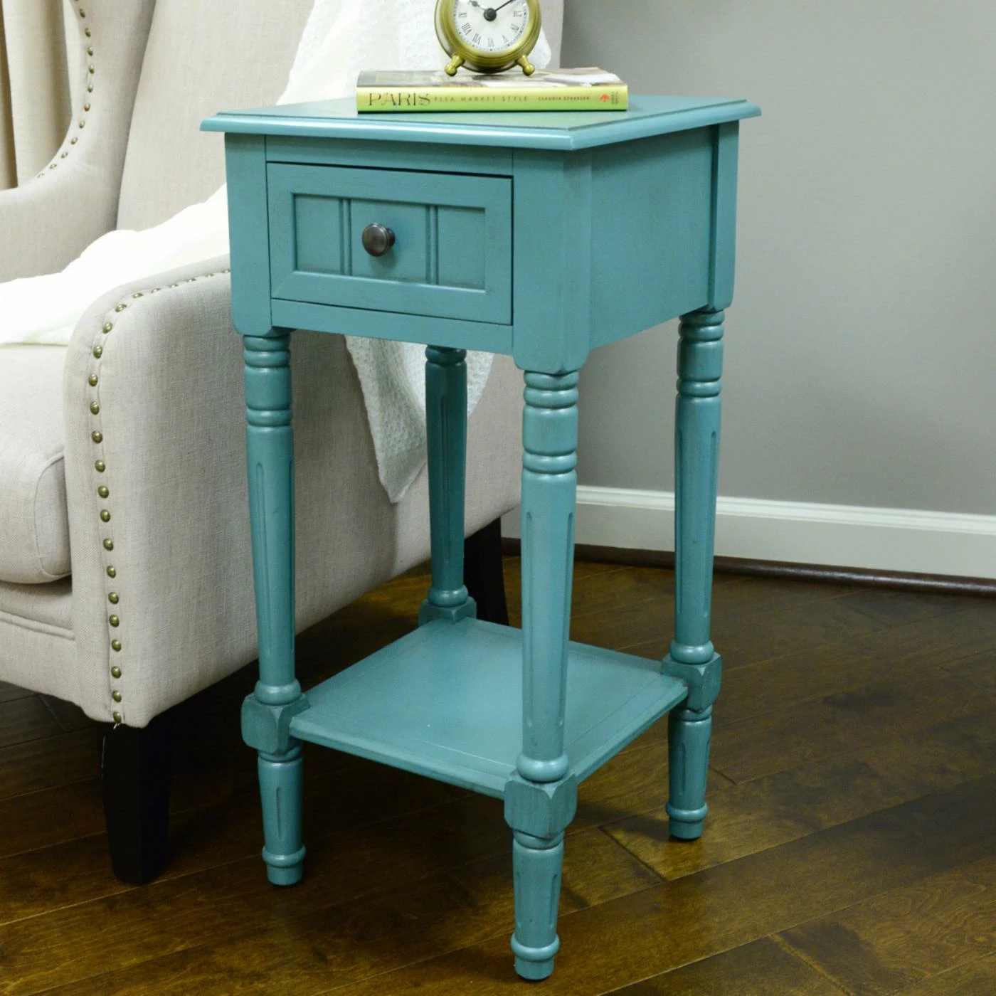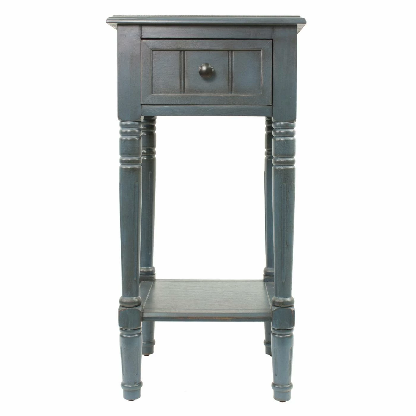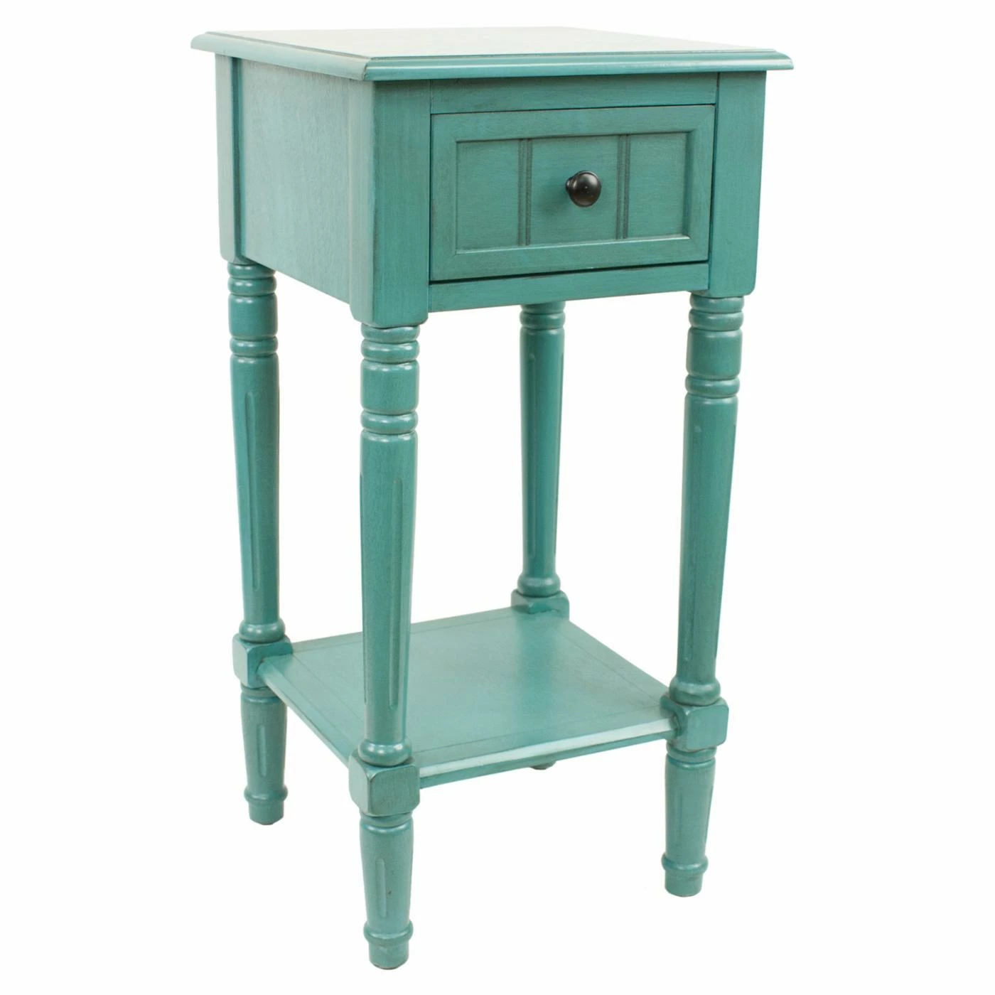 Classical details of this Decor Therapy Simplify One Drawer Square Accent Table include turned and fluted legs plus a drawer front with linear grooves. To make it a sweet treat at your chair, sofa, or bedside, it includes a square top, single drawer, and base shelf. This accent table is made of oak and veneers in your choice of available finish.