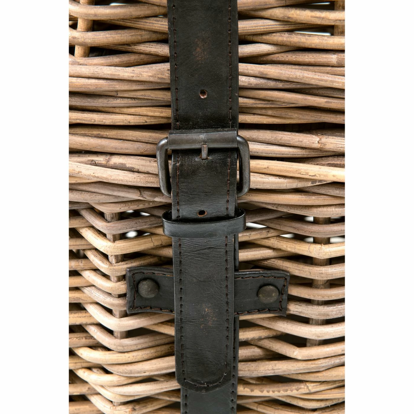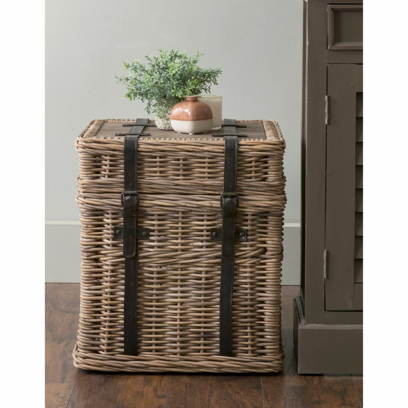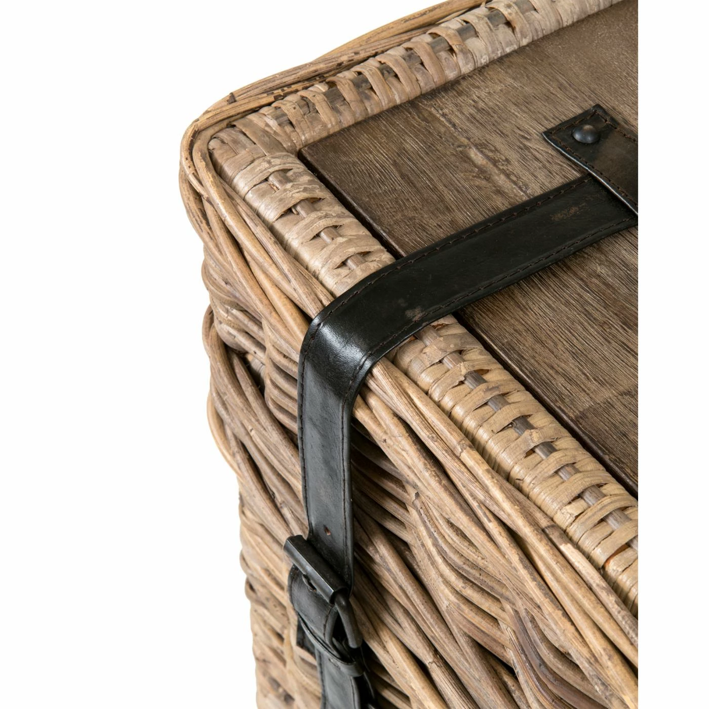 The East At Main Colwell Square Rattan Accent Table is impressively multi-functional. Use it as an accent table and for storage. Its lid lifts to reveal space to store books, blankets, pillows, and more. The accent table is woven from rattan and wicker for a rustic look and accented by black faux leather straps and metal buckles.