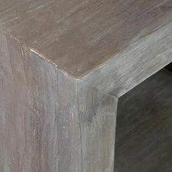 The East at Main Kybos Cube End Table features a modern design with a rustic look. This table is constructed from mindi wood and covered with a washed grey finish. For display, it has an open compartment on the inside. Short, angled legs offer support.