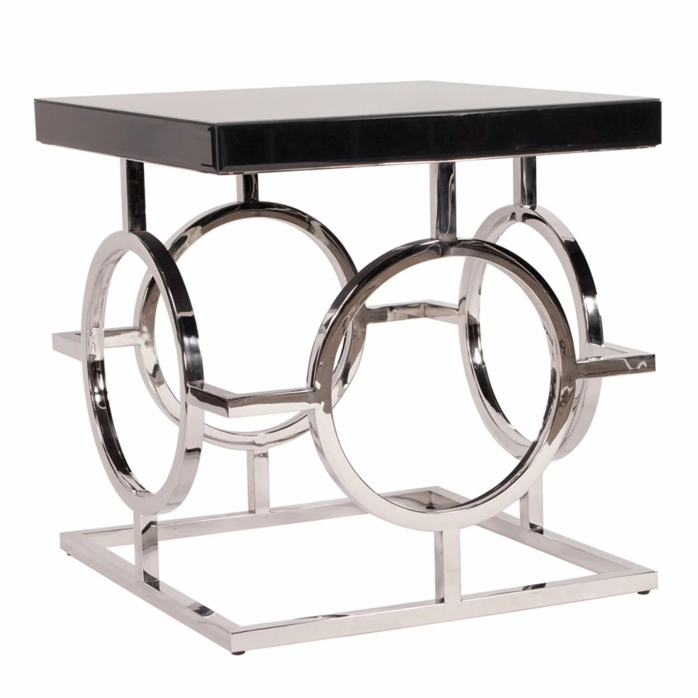 With a look that lives up to the hype, the Elizabeth Austin Stainless Steel End Table with Black Top pleases the modern style palate, fitting a bit of glimmer and drama next to a favorite chair. The top is a glossy, lacquered black, and the base is chromed stainless steel. A circle on each side of the base adds geometric appeal.