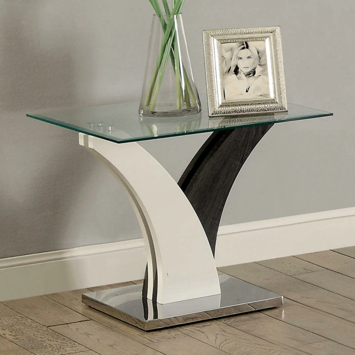 Bring modern pizazz to your dΓ©cor with the Furniture of America Adeena Contemporary Style Flared Base End Table in a triple-toned finish of chrome, dark gray, and gleaming chrome. This end table shows off with a dramatically flared frame that’s crafted of sturdy metal, supporting a tempered glass tabletop with beveled edges. The angular, stainless steel base adds a hint of modern shine to your space and enhances the artistic, geometric appeal of the table.