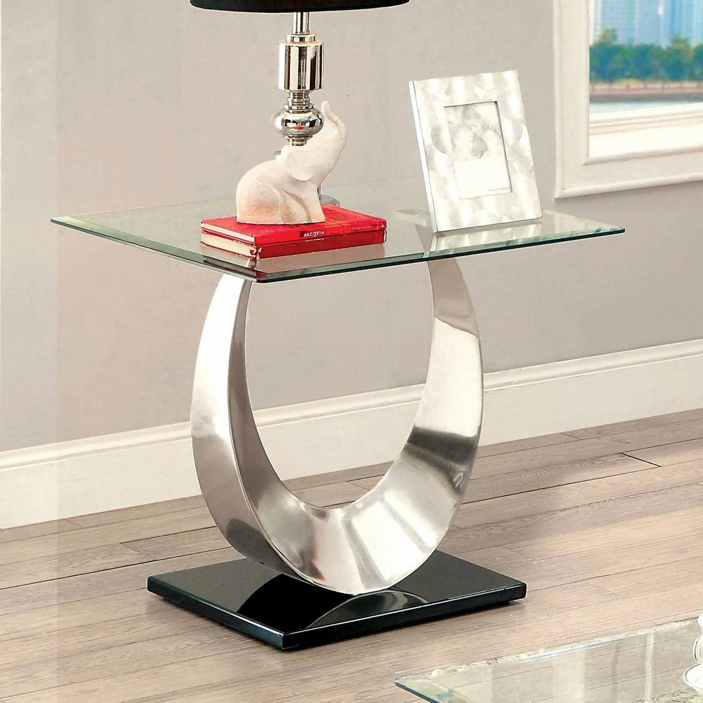 Alluring and contemporary, this Furniture of America Meryl U-Shaped Base End Table livens up any living room. A metal frame offers durable support while the tempered glass tabletop is the perfect play to display and store various items. It’s also finished in silver and black, and has a solid rectangular black panel base that provides stability.