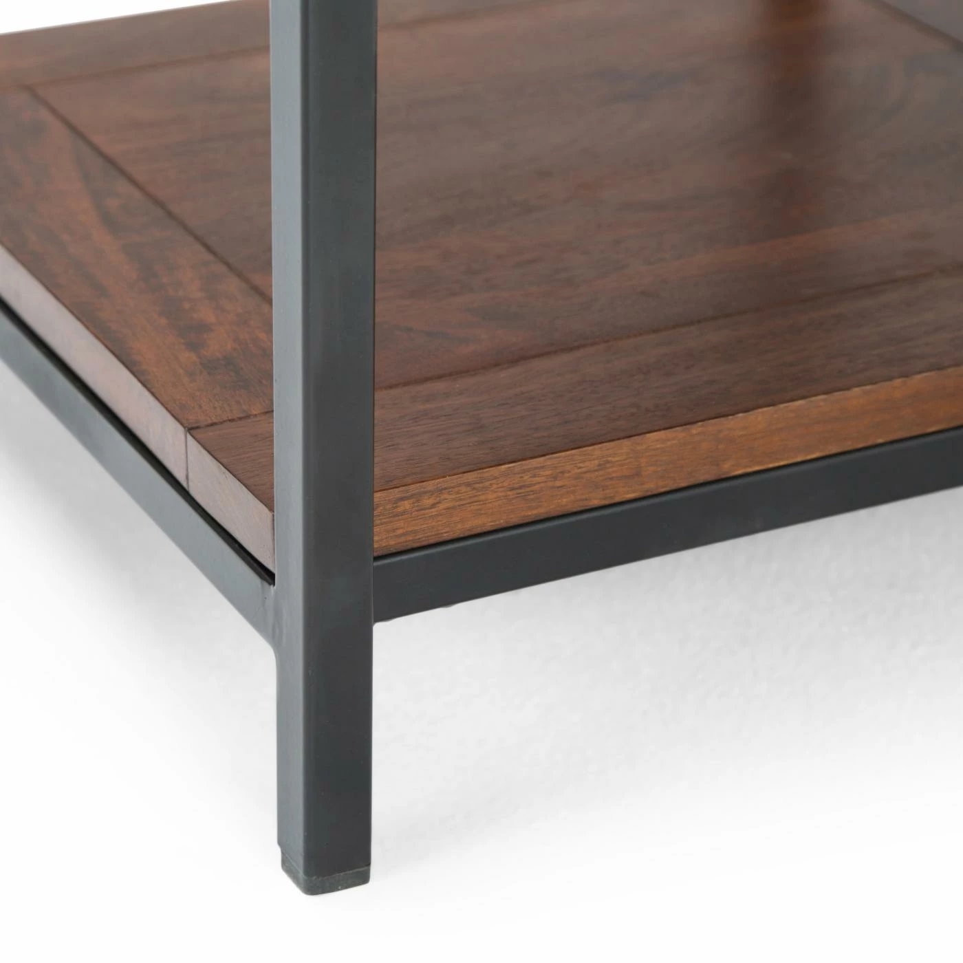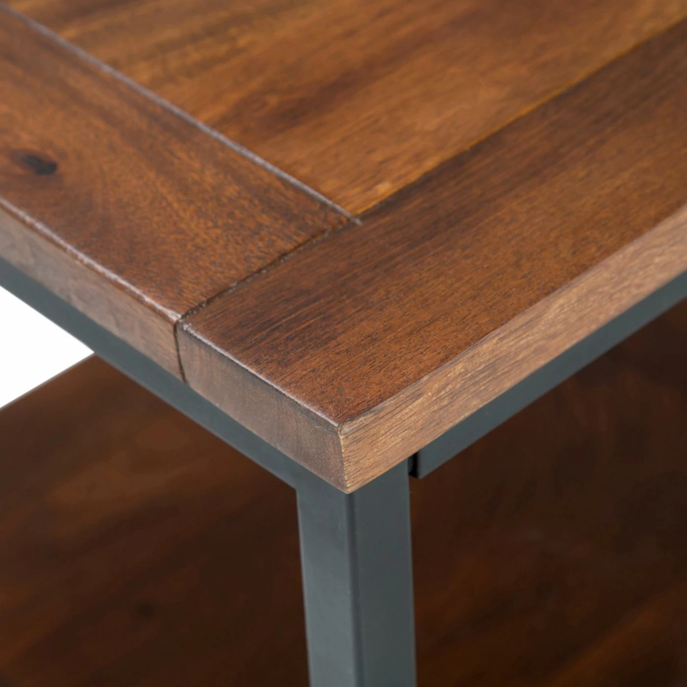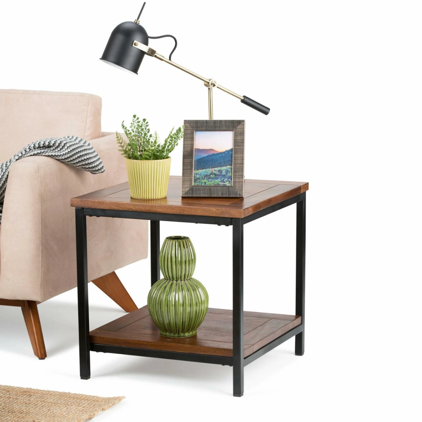 Add a traditional touch to any living space with the HN Home Lansing Traditional Transitional Square Mango Wood End Table. This end table has a simple design with a black metal frame. The mango wood surfaces have a rich brown finish that complements the piece. With a lower shelf, this black and brown end table has extra room for storage or display.