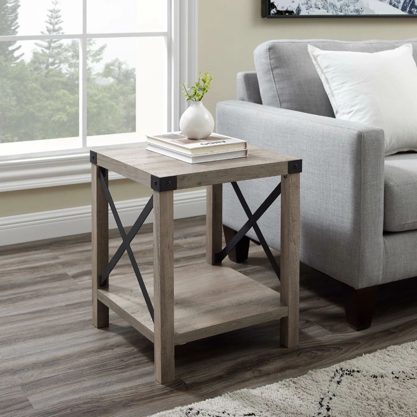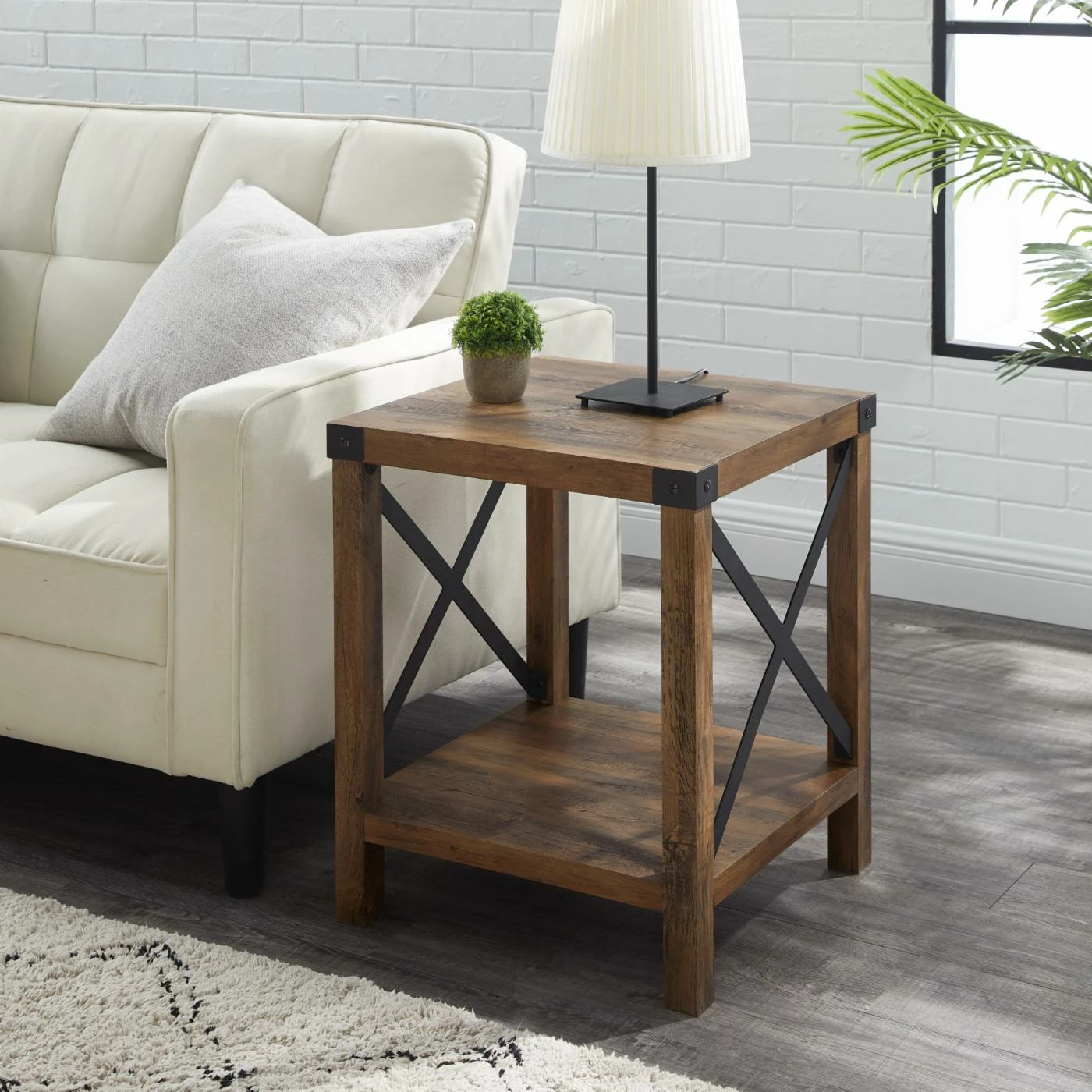 Bring a reclaimed rustic look to your living room with HumbleNest Countryside 18 in. Weathered Metal X Accent Table. This side table comes in your choice of available finishes to coordinate with your dΓ©cor. Black metal X design accents and corner brackets lend a subtle industrial feel to the table. The table is durably crafted with engineered wood. A lower shelf offers space to display decorative items or store magazines.