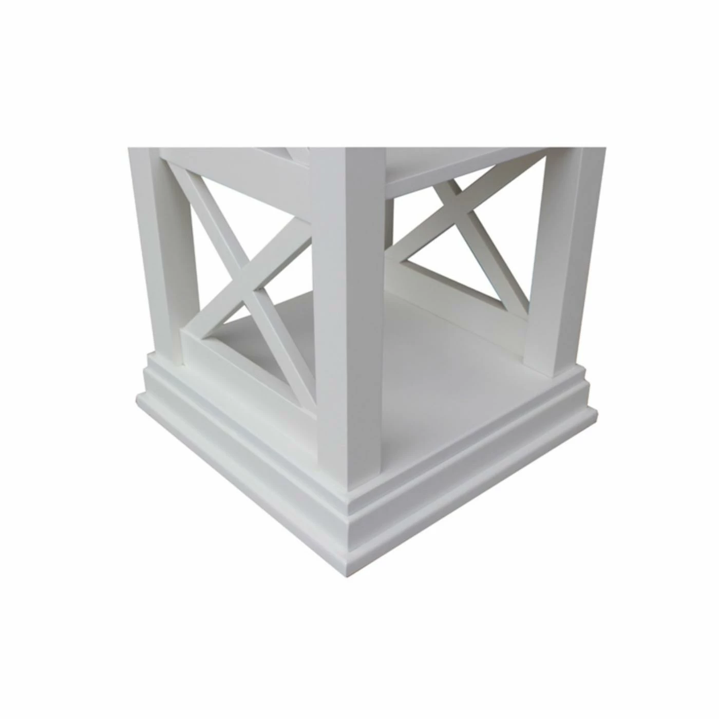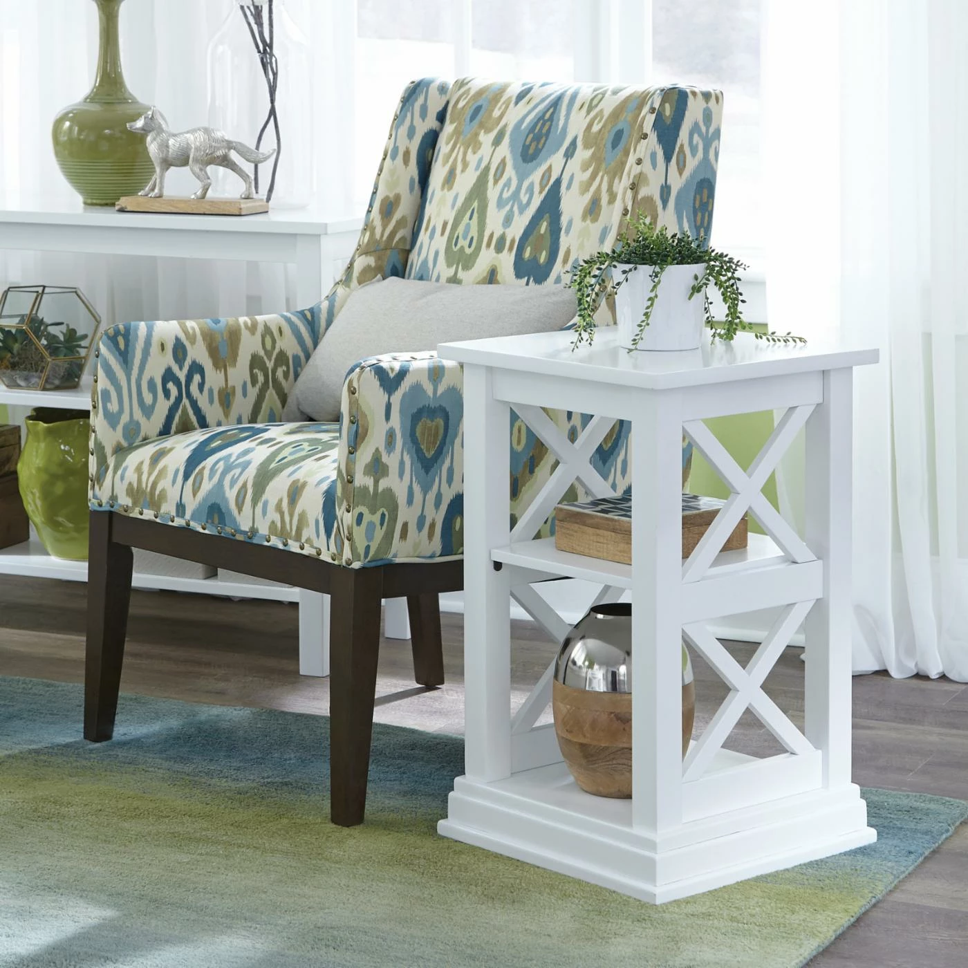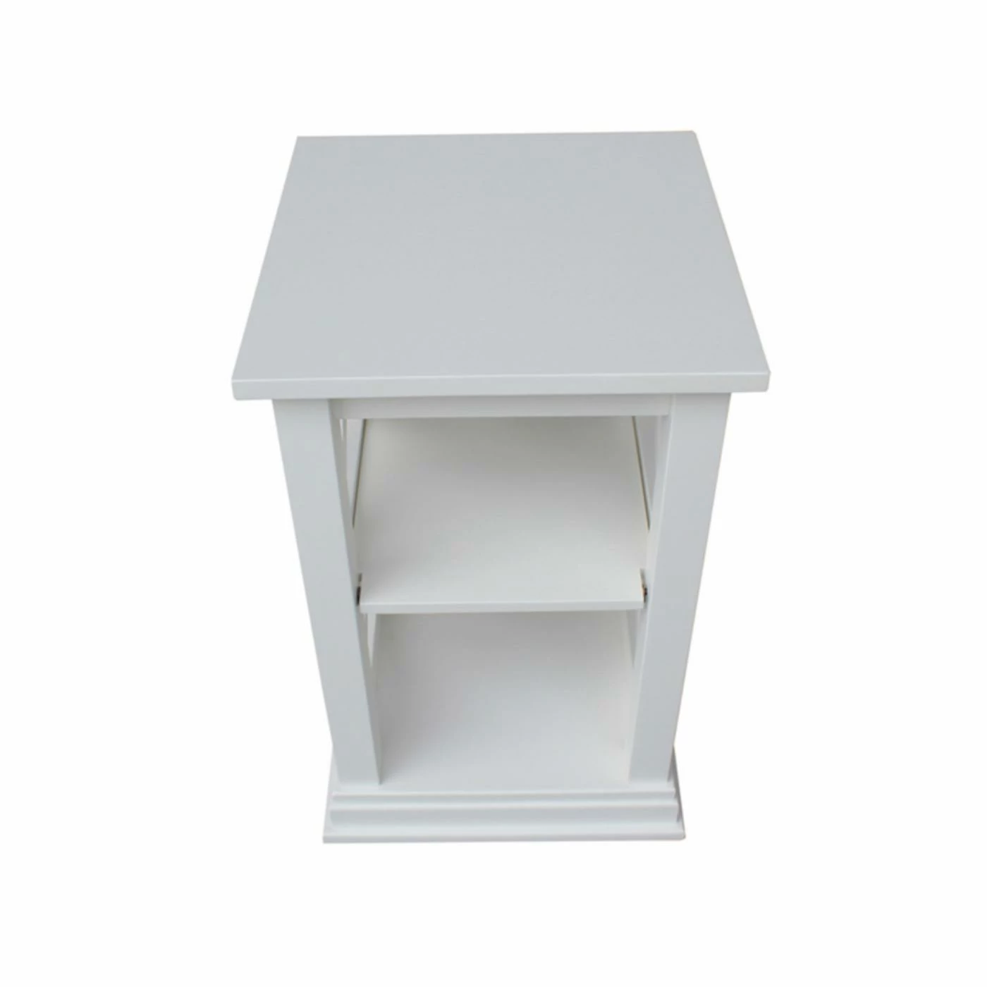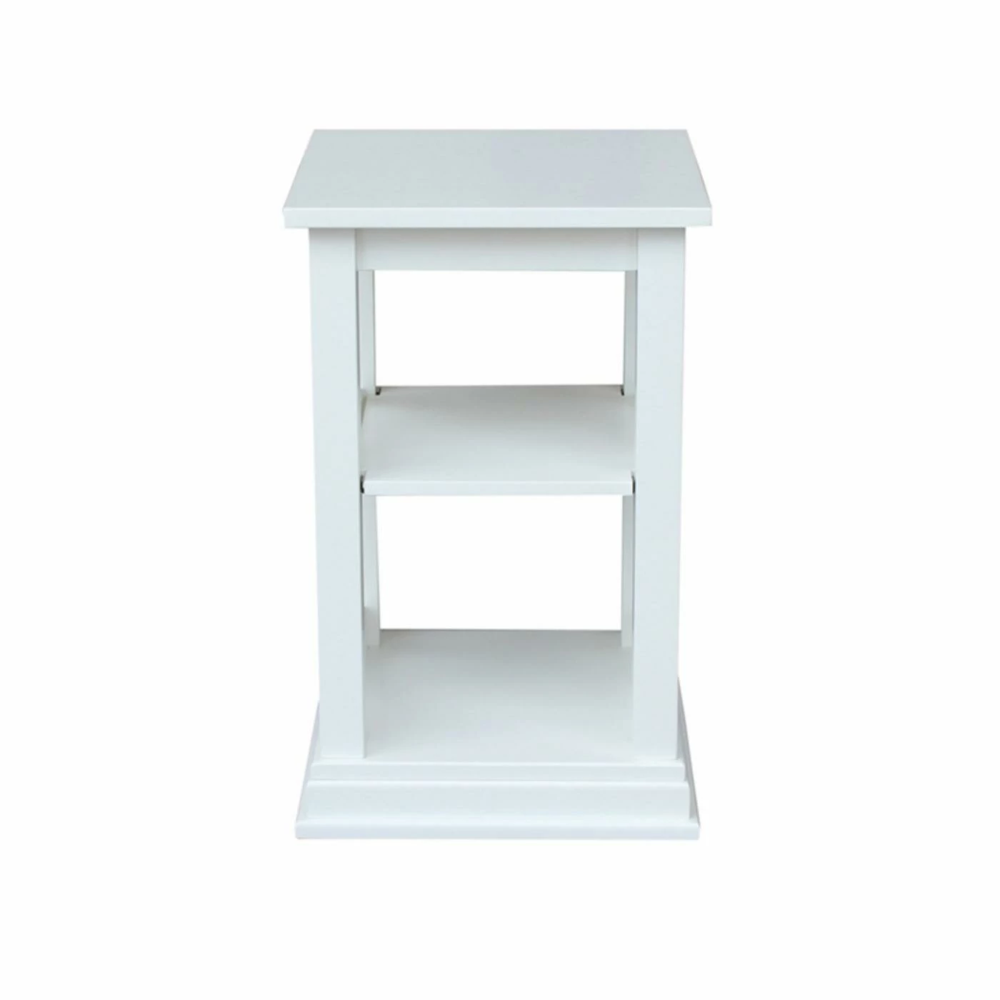 The International Concepts Hampton Accent Table is a highly functional piece that uplifts the ambiance of your space while helping you maximize every inch of your space. Store books or treasures on the open shelves. Cross-braced sides and a crisp white finish create a look that coordinates with modern farmhouse, cottage, and other transitional styles. The top is crafted using the same techniques that form a traditional butcher block. Some assembly is required.