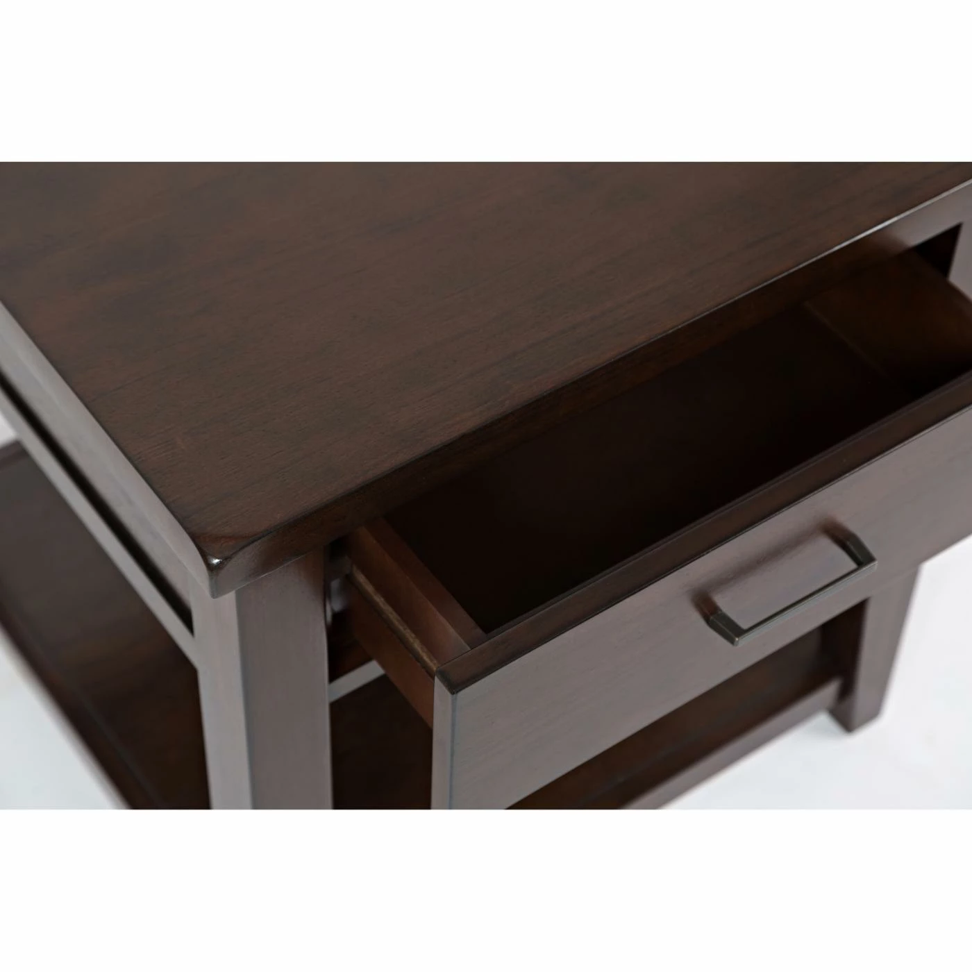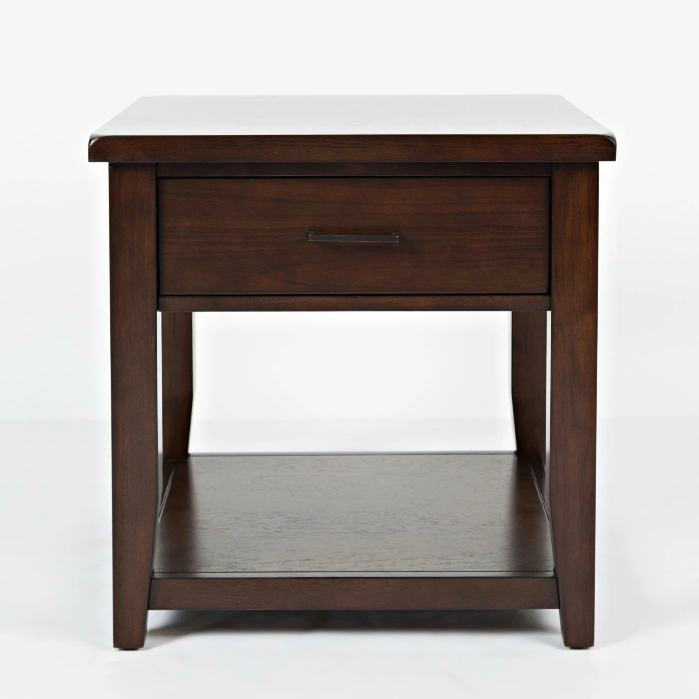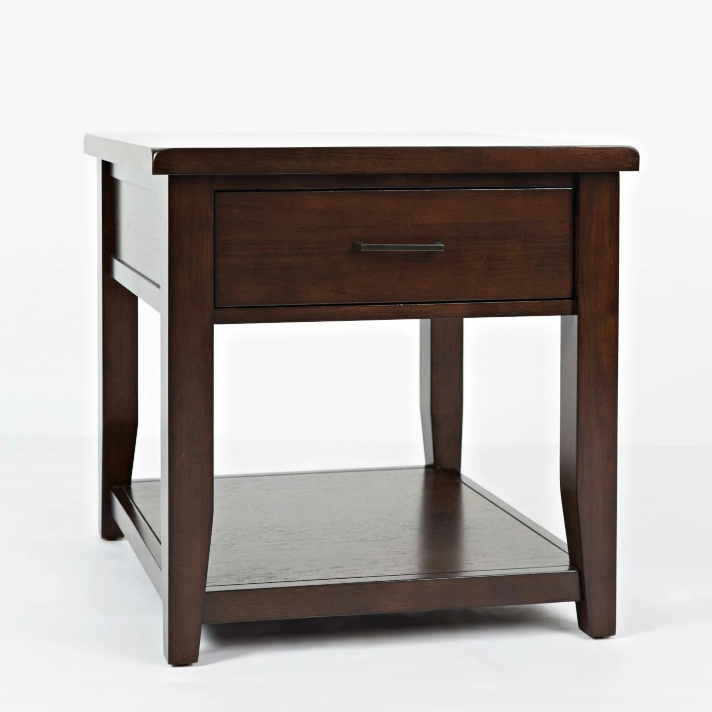 Simple and sophisticated, the Jofran Twin Cities End Table is a stunning addition to any living room. Its rich brown finish and transitional design complements any home, while its durable wood construction makes this end table perfect for high-traffic areas. The single drawer gives you a place to store remotes, devices, books, and other small items, while the bottom shelf is great for displaying magazines and decorative pieces.