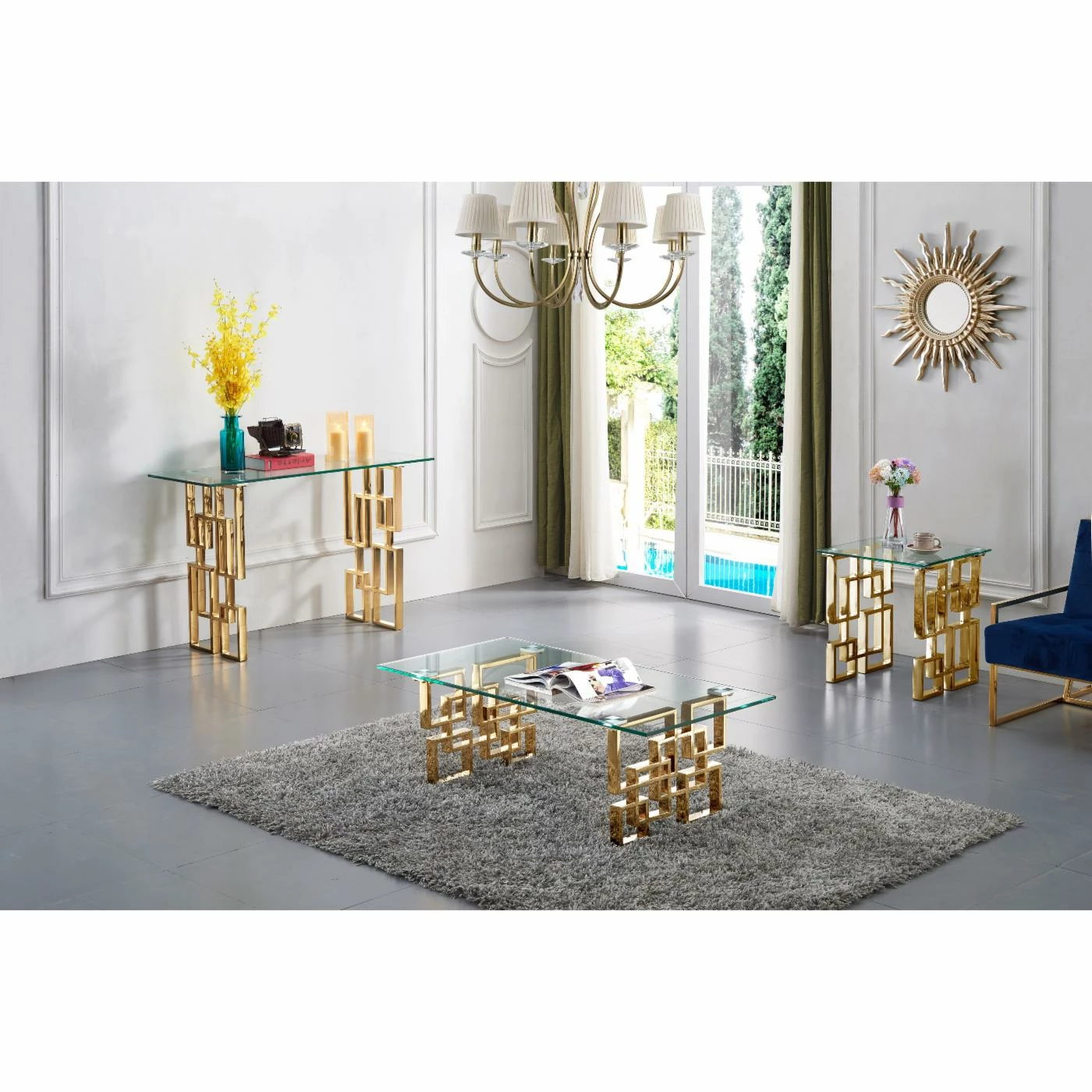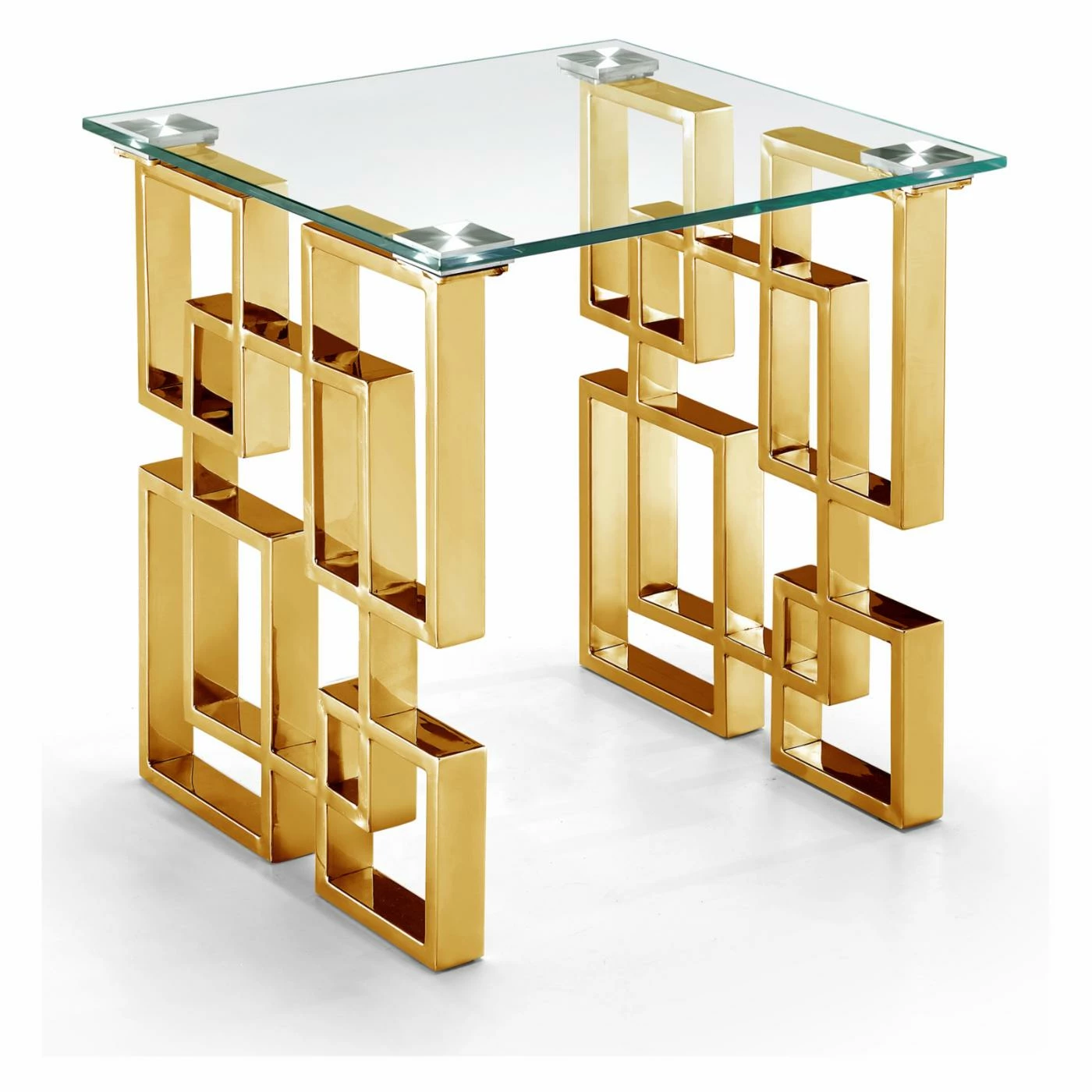 A thick tempered glass surface makes the Meridian Furniture Inc Pierre Gold End Table as practical as it is pretty. Geometric, sculptural steel legs in a gleaming gold finish give this end table its visual drama. Combine it with other occasional tables in the Pierre collection for a cohesive living room design with high glam style.