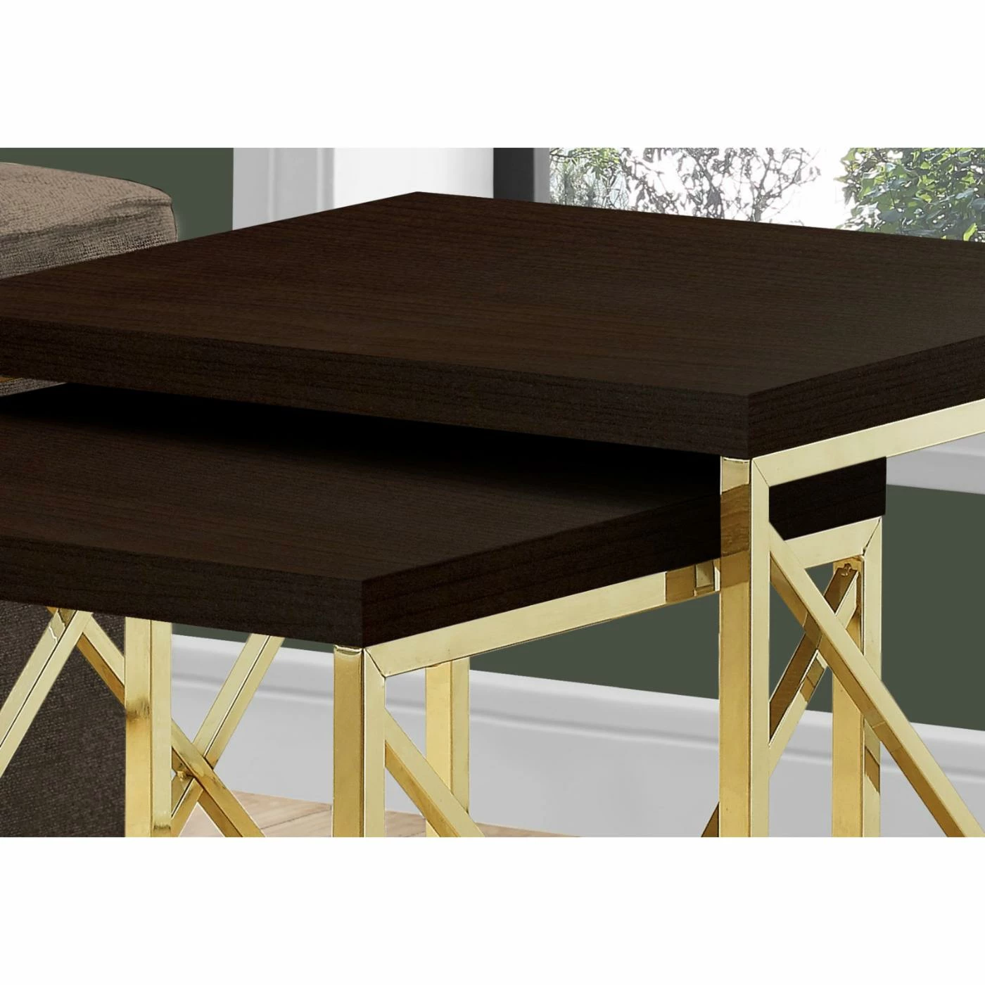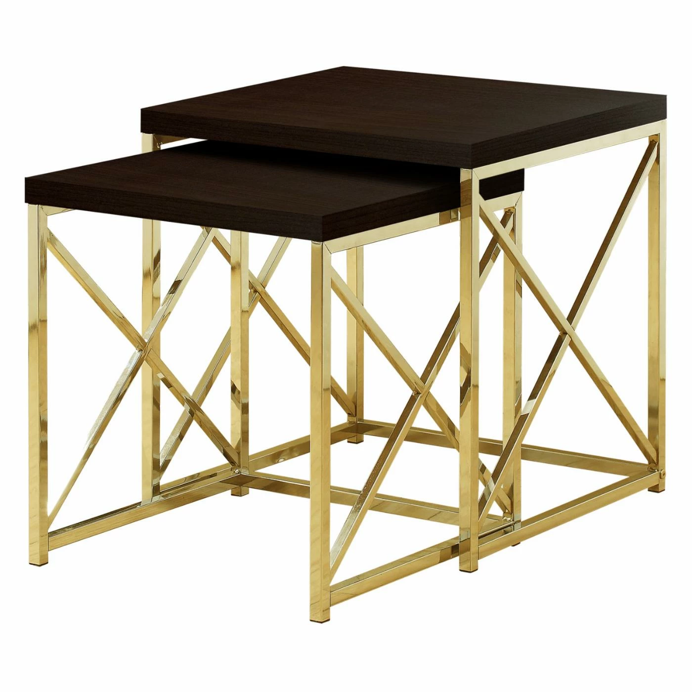 Bold design meets smart function with the Monarch Specialties Metal X-Base Nesting Table – Set of 2. Stylish criss-cross gold metal bases support engineered wood tops in a rich cappuccino finish. Spread them throughout your space or nest them together when you need extra room.