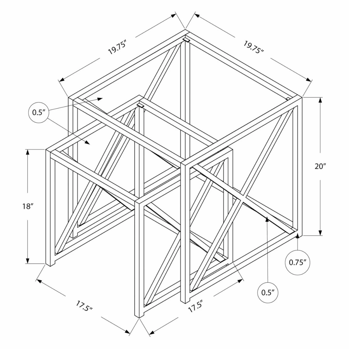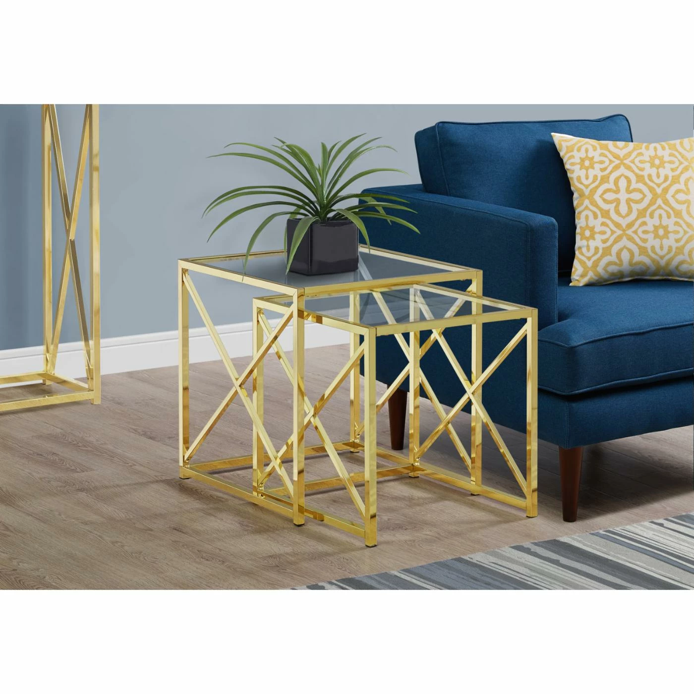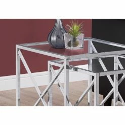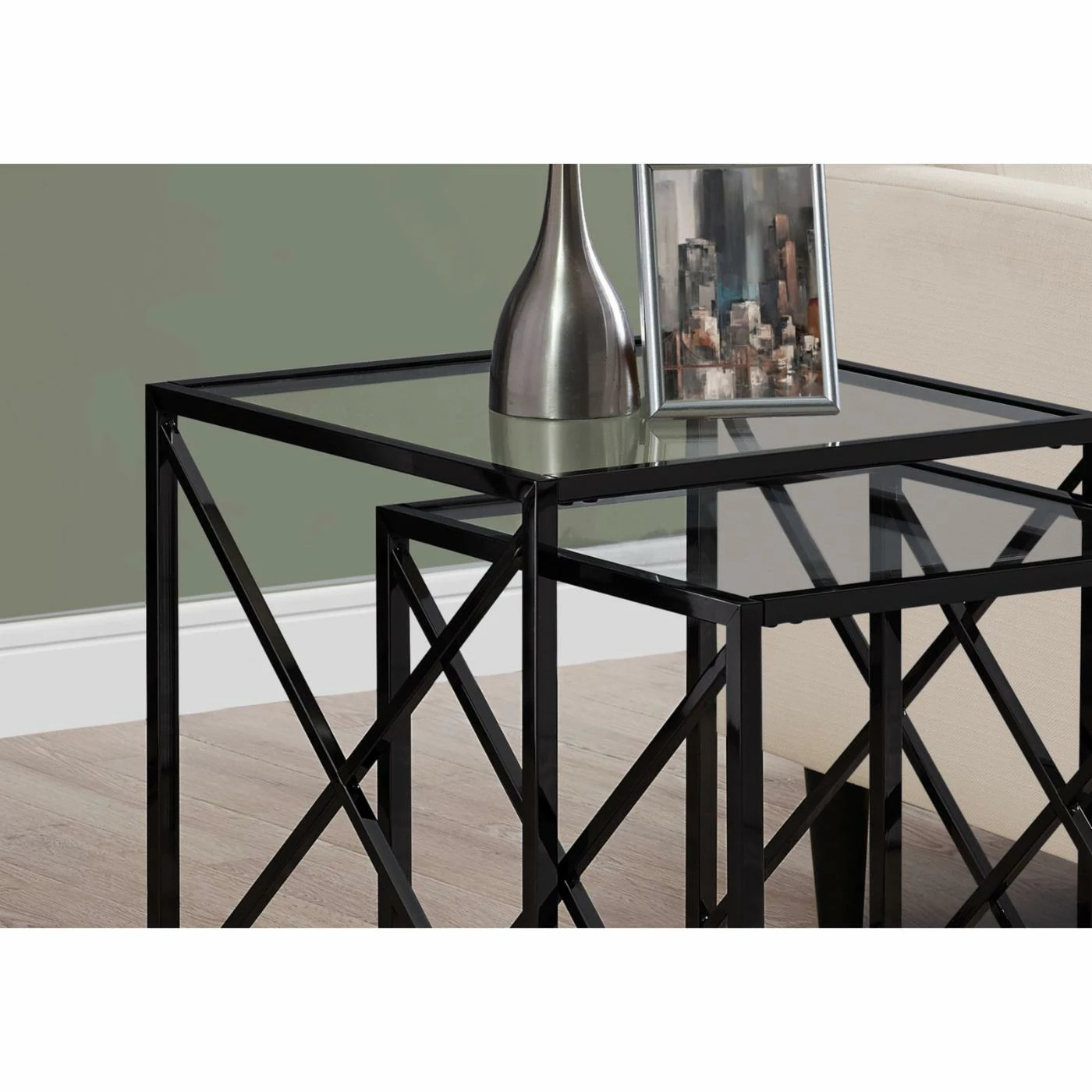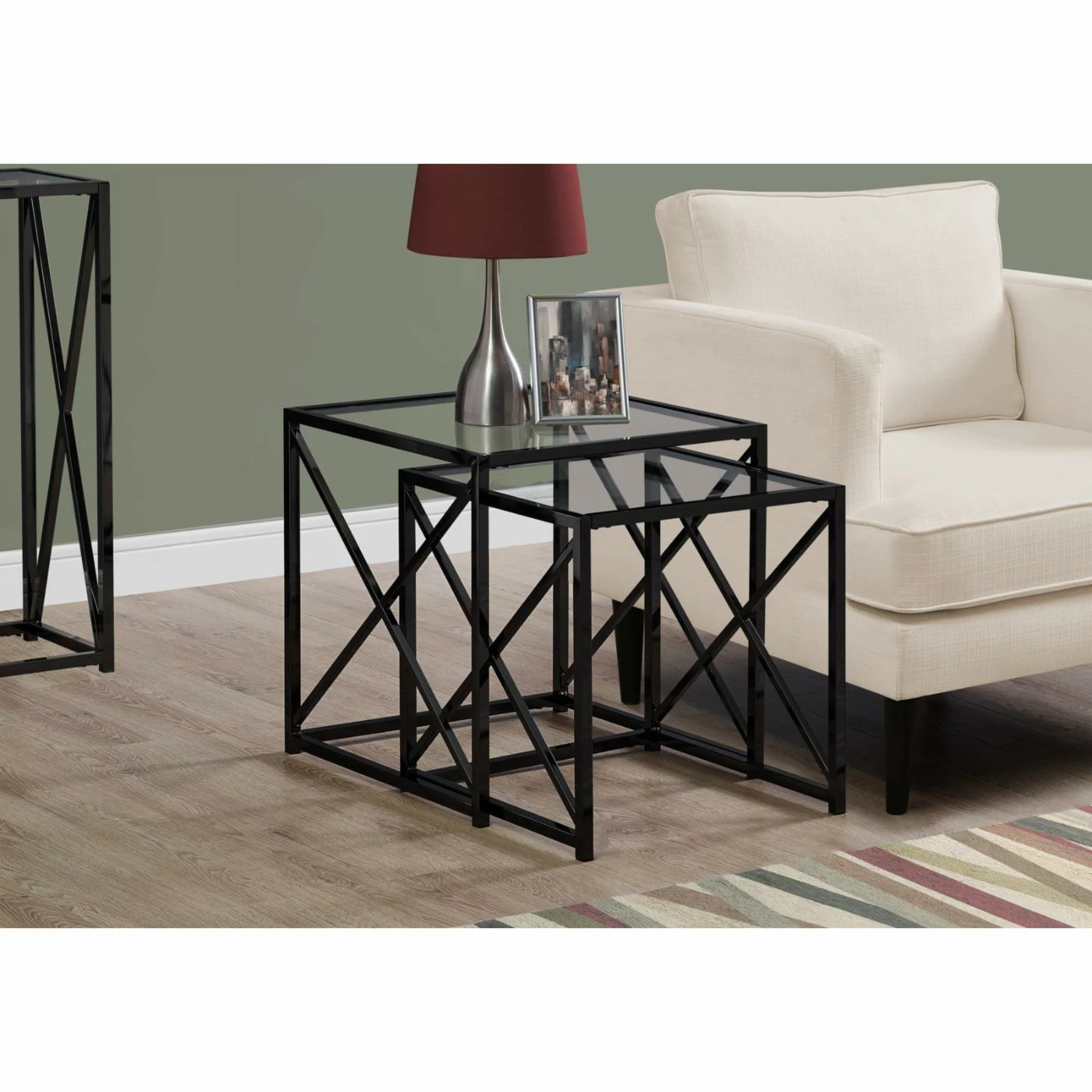 Spread the Monarch Specialties Tempered Glass Metal X-Base Nesting End Table – Set of 2 throughout your space, then nest it together when you need extra room. This stylish set of square end tables features sleek metal frames with X style accents and thick tempered glass surfaces to withstand every need. Choose the finish option that best suits your space.