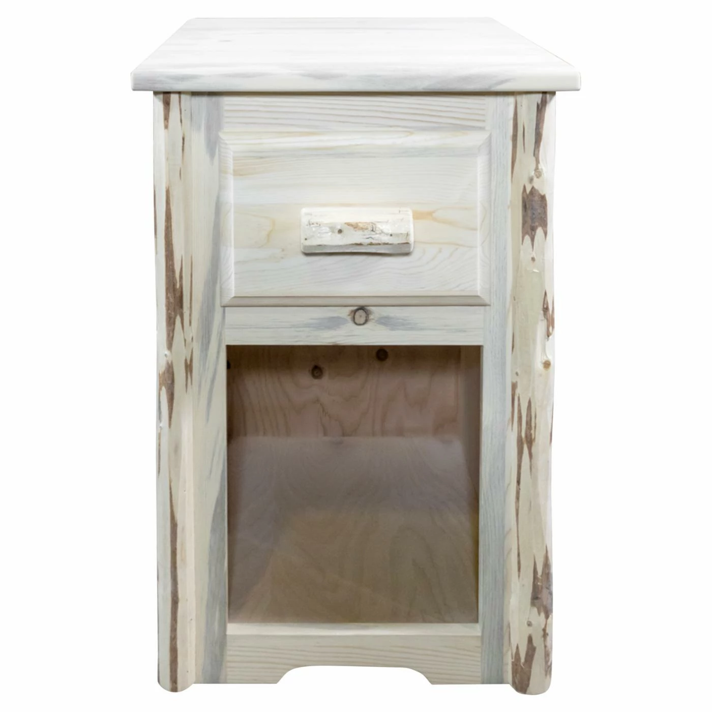 Introduce rugged charm and functionality with the Montana Woodworks Montana End Table with Drawer. Just the thing bedside or chairside, this heirloom-quality end table is handcrafted in Montana from solid, U.S.-grown, lodge pole pine wood. To get that coveted look, details are skip-peeled by hand using old-fashioned draw knives. This end table includes a drawer with full extension ball bearing slides and an open cubby below. It’s offered in your choice of available finishes.