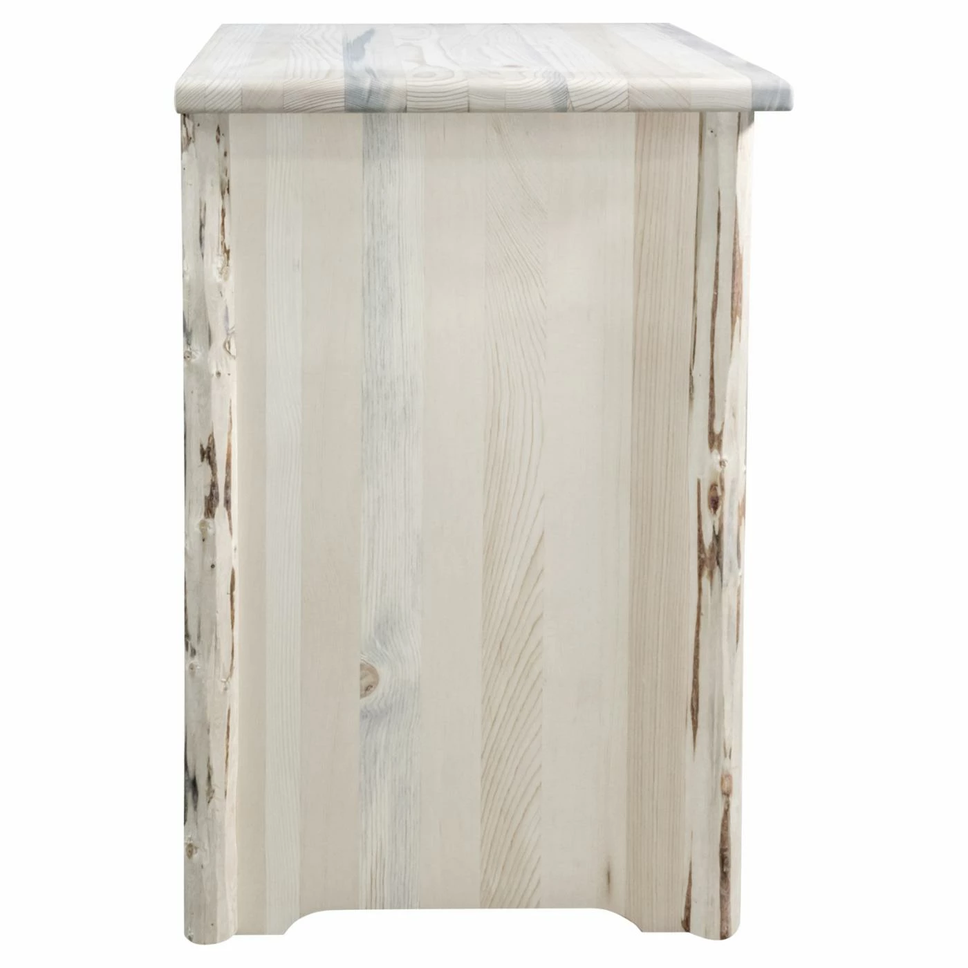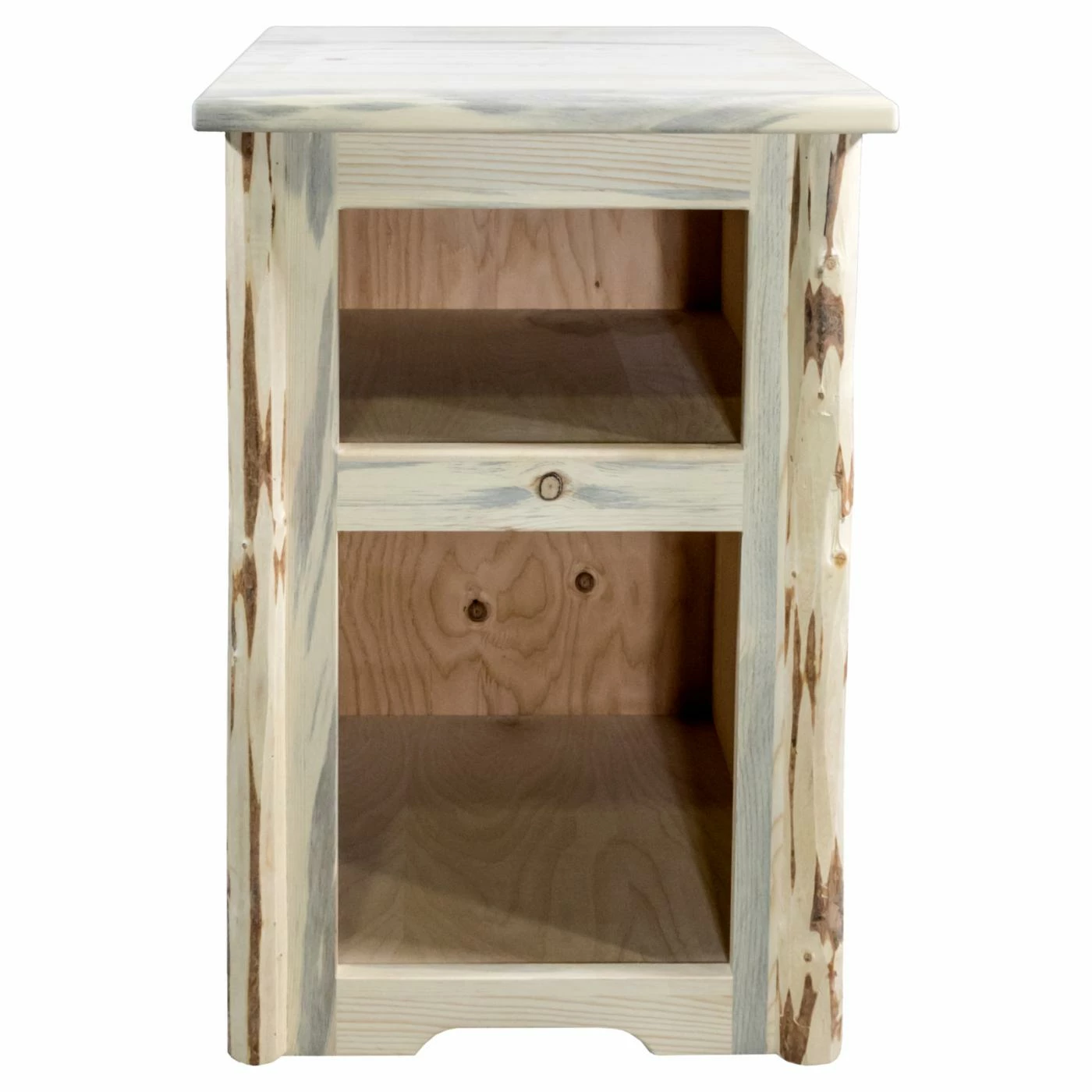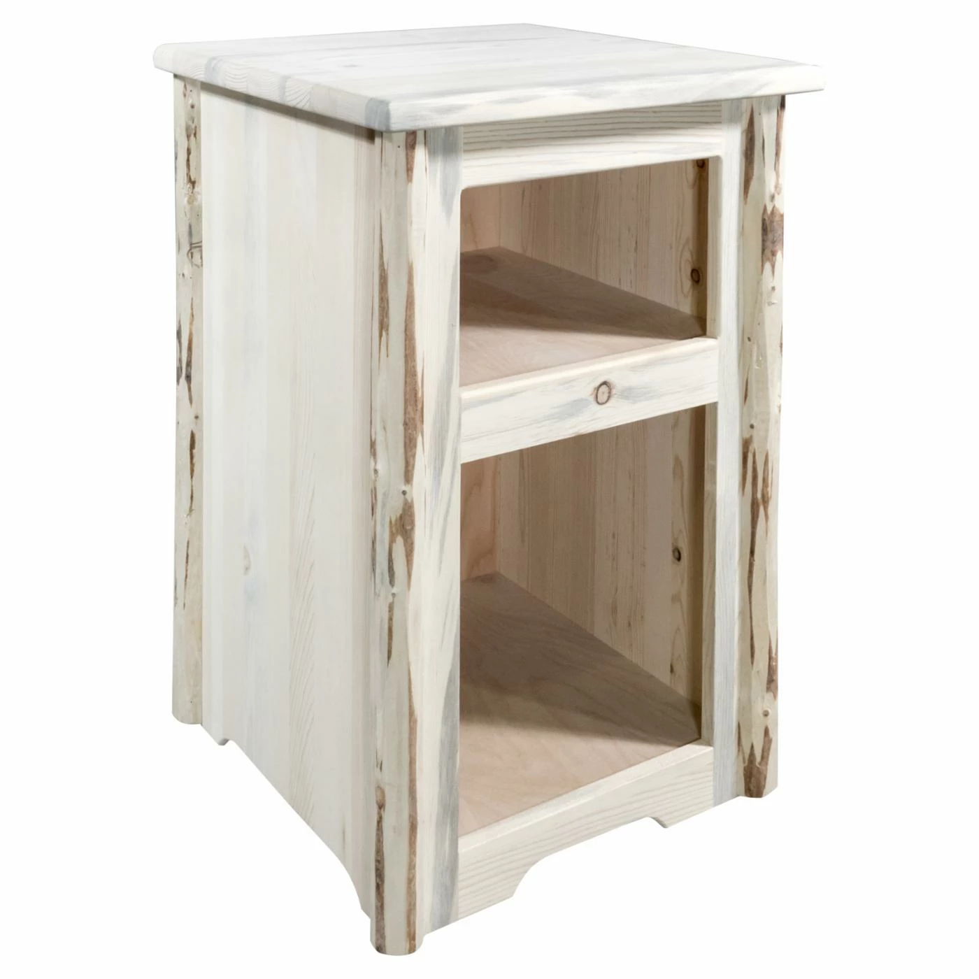 Two open cubbies make the Montana Woodworks Montana End Table a great choice as a chairside table or nightstand. This end table is handcrafted of solid, U.S.-grown, lodge pole pine wood. It features details skip-peeled by hand using old-fashioned draw knives for a true hand-hewn appeal. Choose from available finish options.