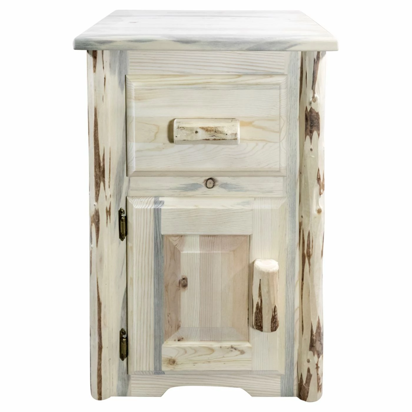 To add practicality, the Montana Woodworks Montana Left Hinged End Table with Drawer includes a drawer and door with hinges on the left hand side. This handcrafted end table also makes a smart nightstand. It’s built in Montana using solid, U.S.-grown, lodge pole pine wood. To get that ultra rustic look, details are skip-peeled by hand using old-fashioned draw knives. This table is offered in your choice of available finishes.