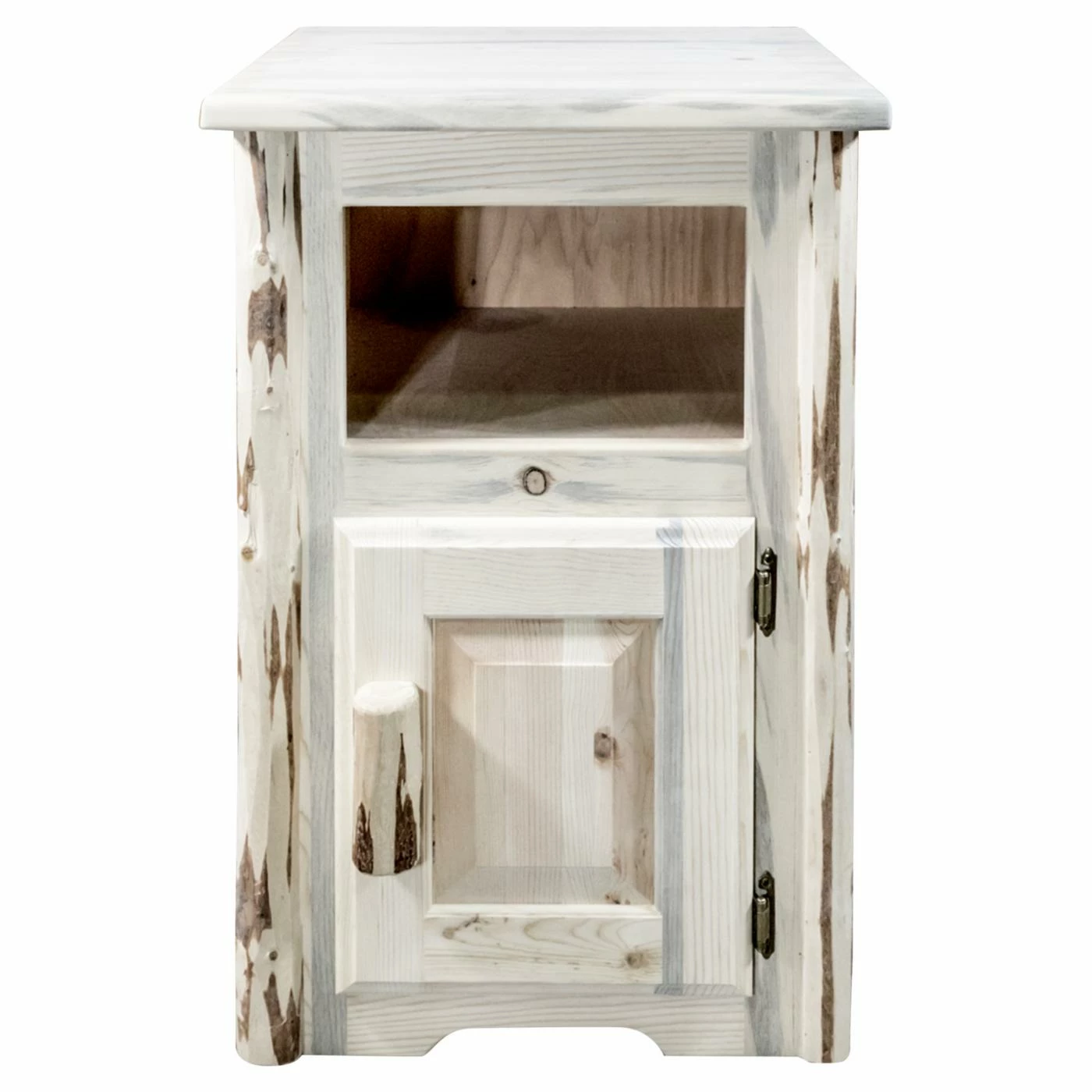 The Montana Woodworks Montana Right Hinged End Table is a handy and handsome addition chairside or bedside. It’s handcrafted of solid U.S.-grown lodge pole pine. For rustic appeal, details are skip-peeled by hand using old-fashioned draw knives. The table includes a spacious top, open shelf, and cupboard door with hinges on the right hand side. Choose from available finish options.