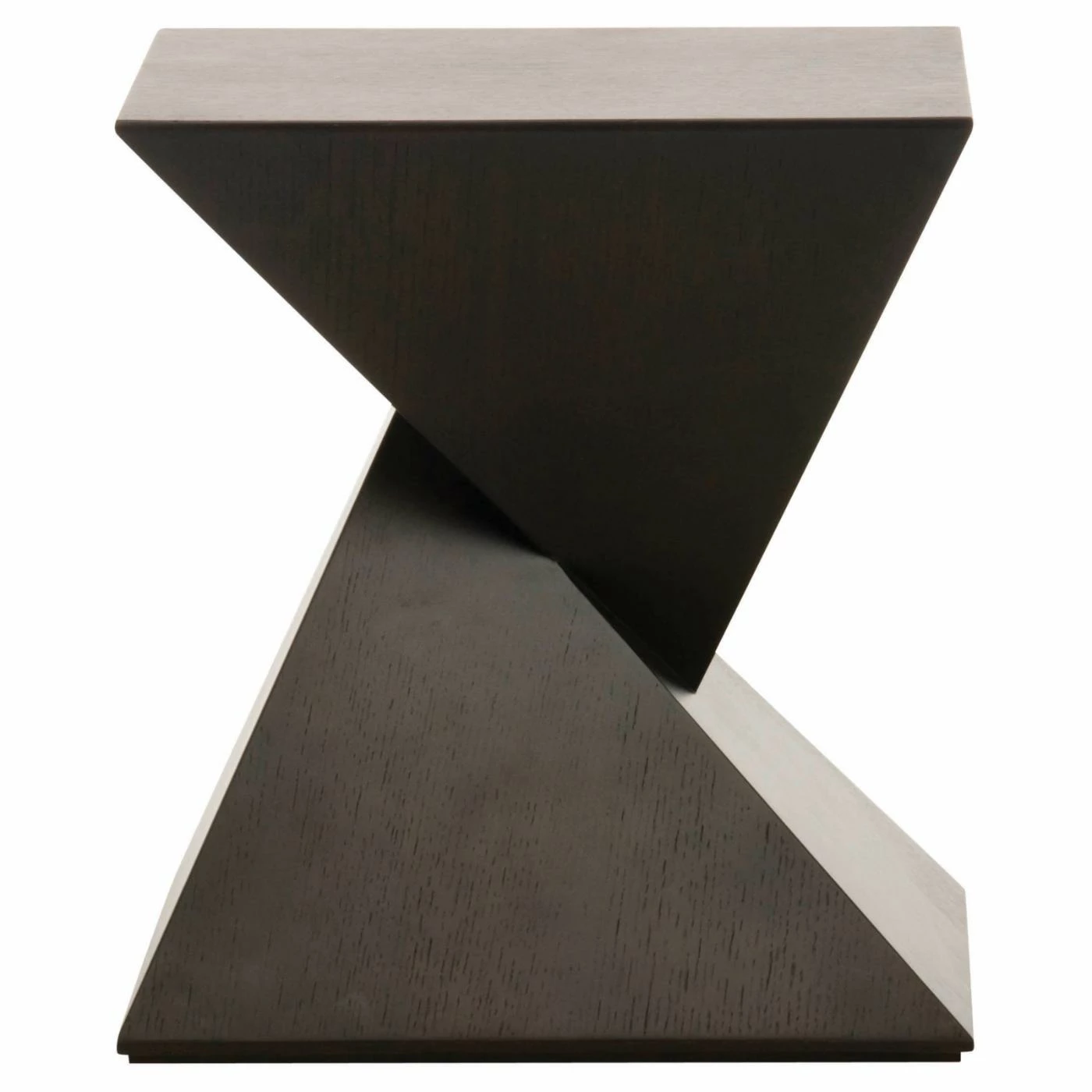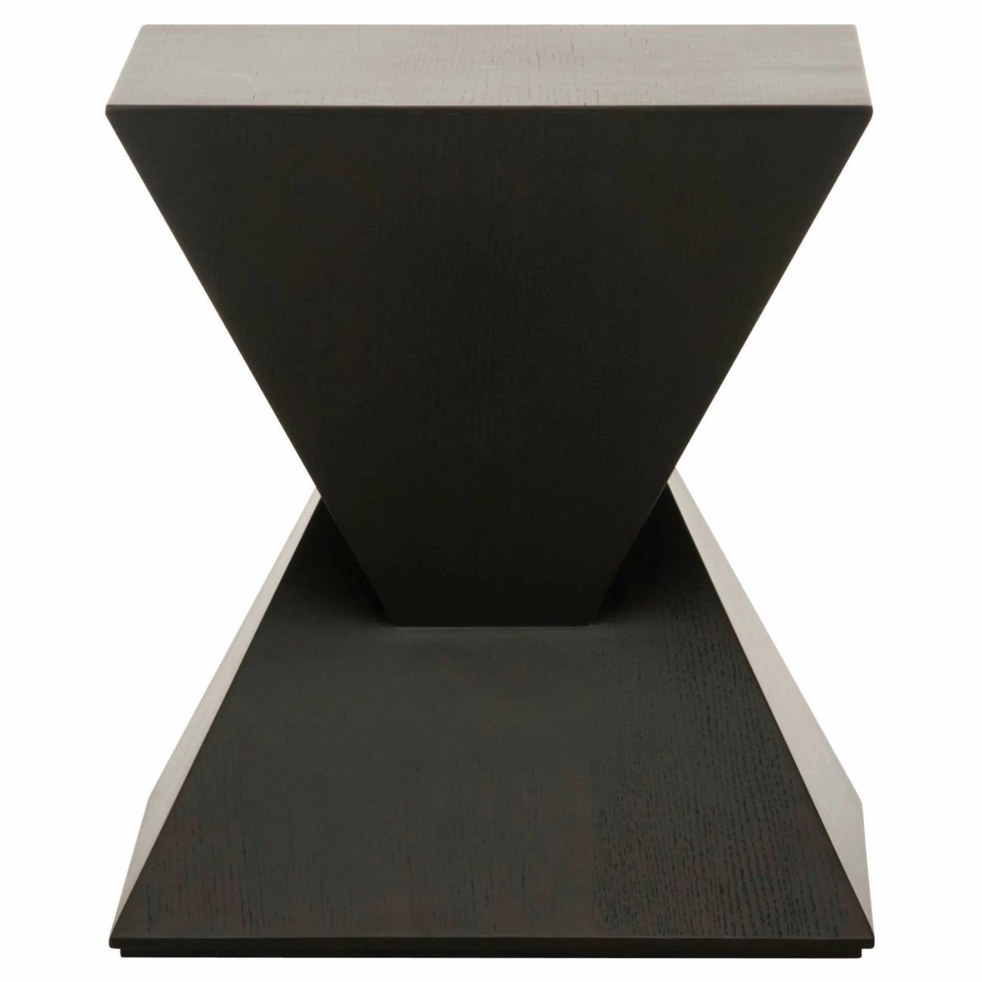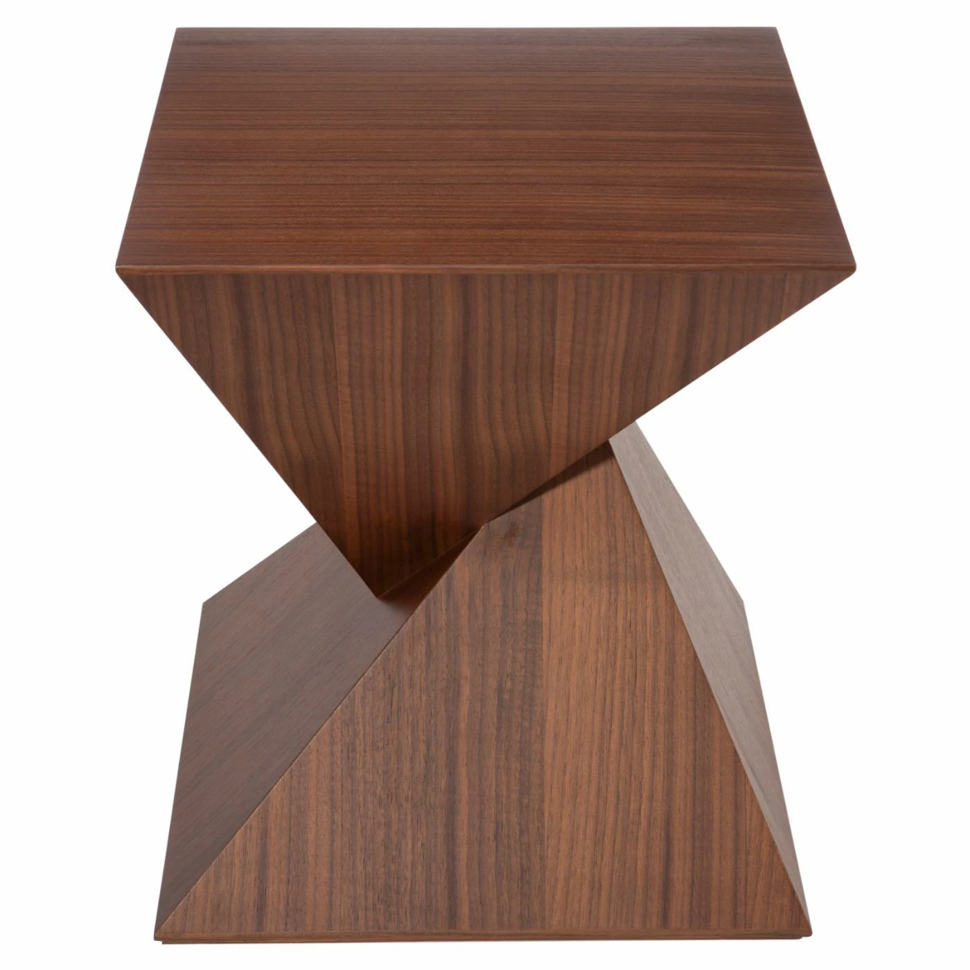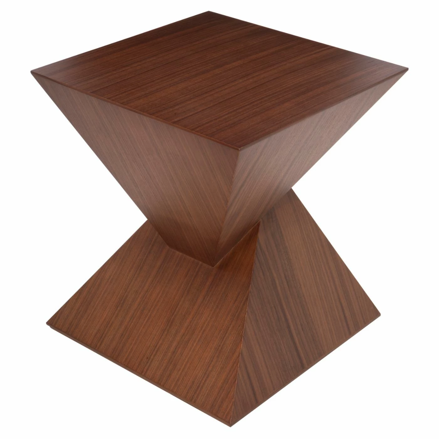 The Nuevo Giza End Table is a wonder to behold. This piece is constructed from tough medium-density fiberboard, an outstandingly strong material for an outstanding piece. Available in American walnut or stained oak veneers, the choice is yours what will look best for your space. This table boasts a fantastically unique and alluring design: two square pyramids join together, one upright and one upside-down, making this piece a fascinatingly original addition to your decorating scheme. Decorate like an Egyptian. This table measures 15.75W x 15.75D x 17.75H inches.