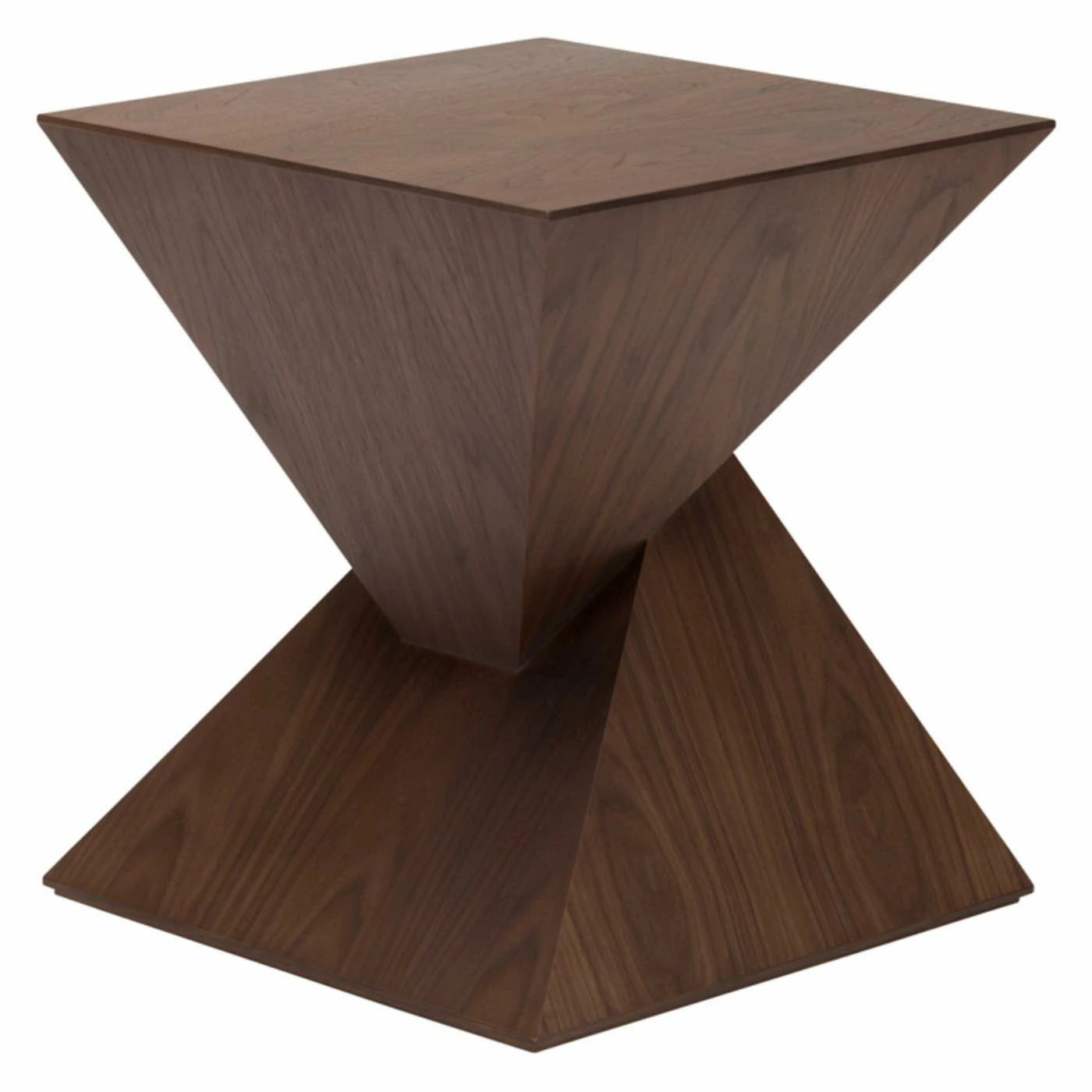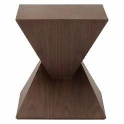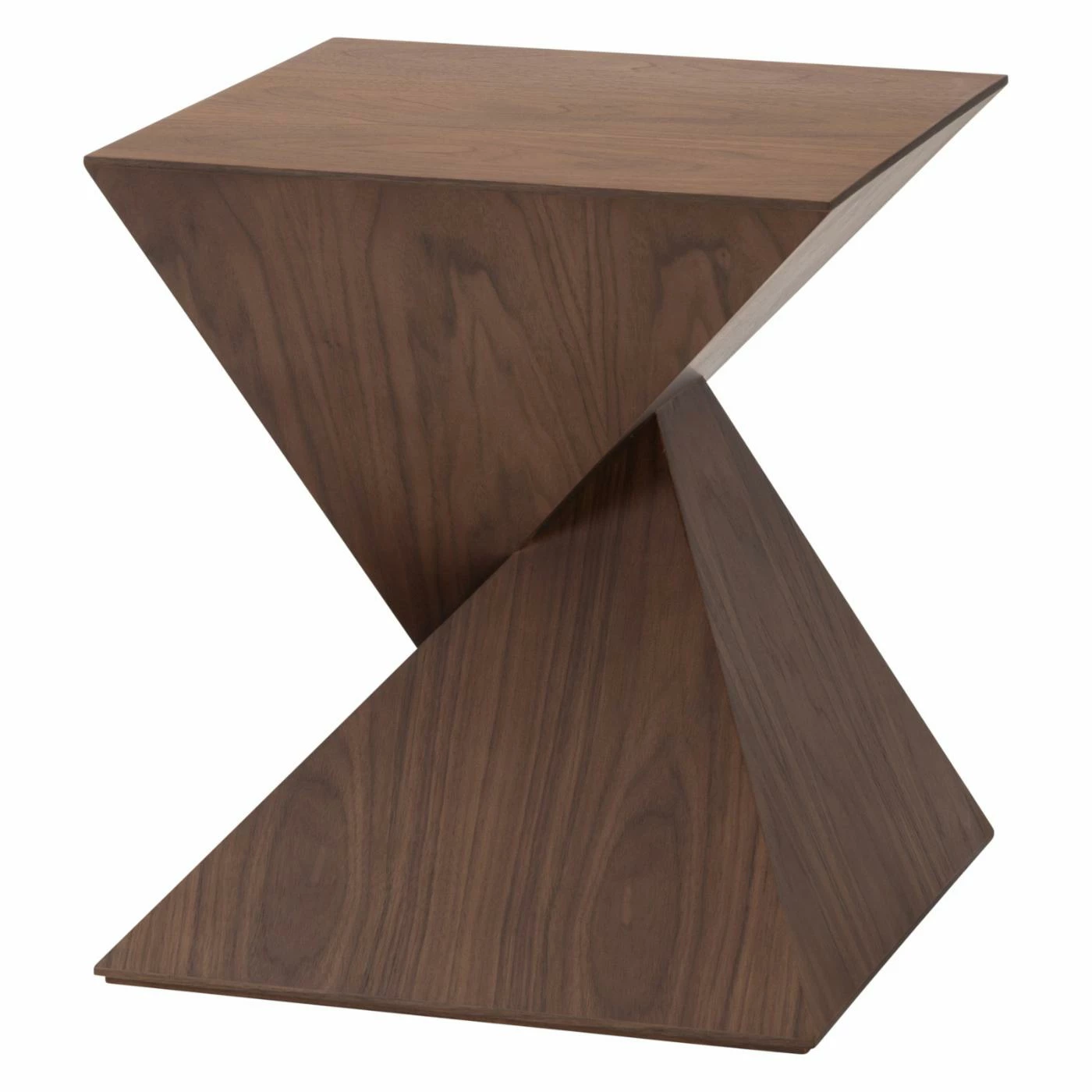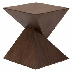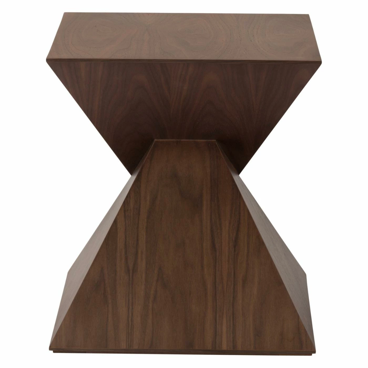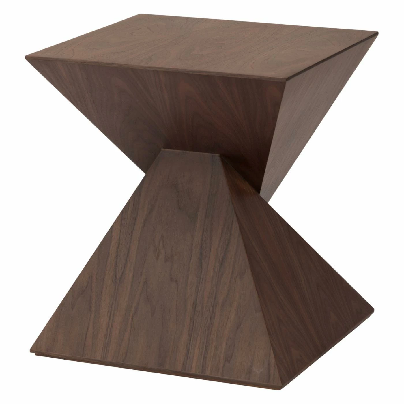 Invite the Nuevo Giza Side Table into your living room for a dynamic centerpiece or side accent. Its design is comprised of two pyramid shaped pieces melded into one hourglass-style shape. The table is constructed from a lightweight and durable medium-density fiberboard core. Rich brown American walnut veneers overlay the core, providing a deep color and grain pattern.