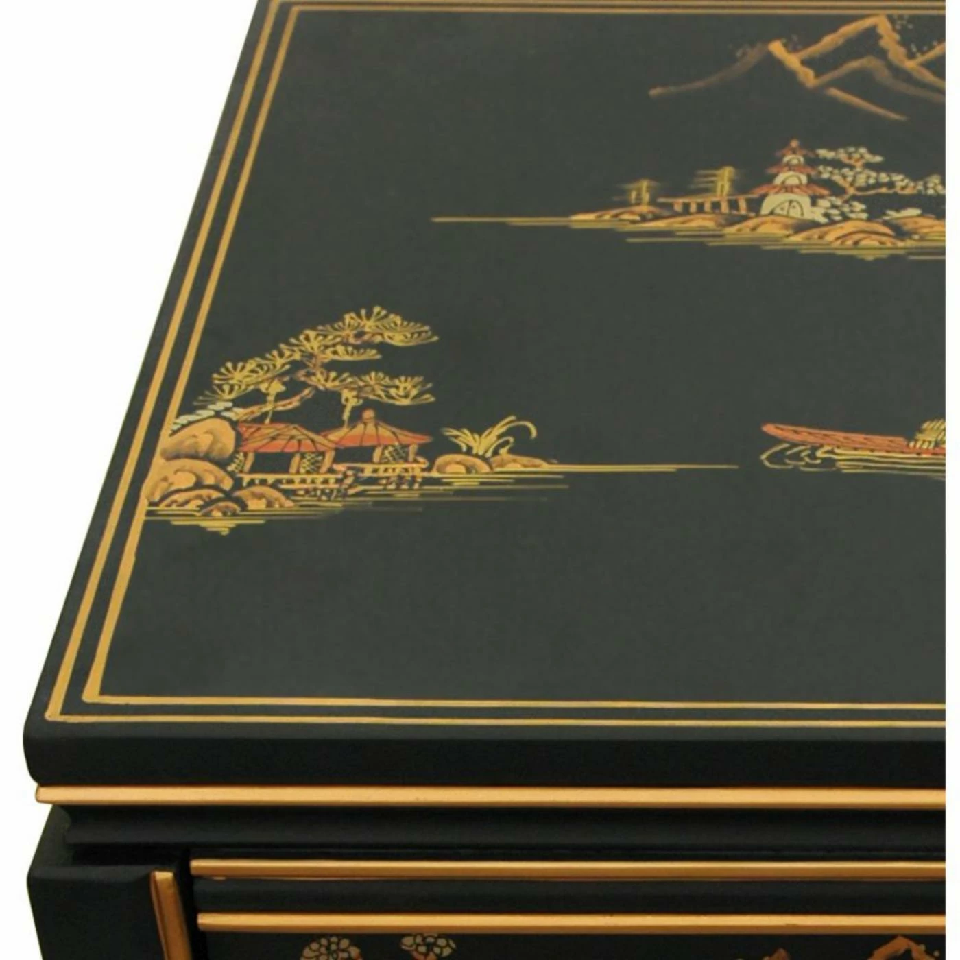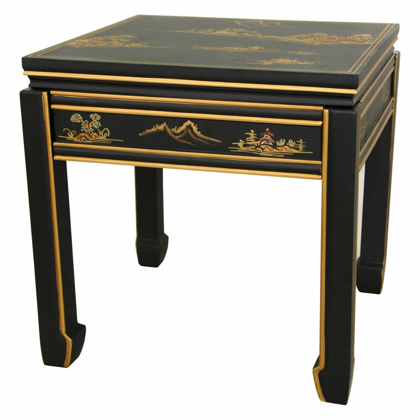 The Oriental Furniture Black Lacquer Ming Table is a simplistic yet elegant piece that’s hand-crafted in a small artisanal workshop in southern China. It’s made from solid kiln dried spruce and is topped with a 12-coat hard, black lacquer finish that flaunts a lovely medium-gloss shine. The top and sides are adorned with hand-painted landscape images, and gold paint is used to accentuate the table’s shape and make the piece more dramatic. This table is a great choice for complementing your living room dΓ©cor or for creating a focal point in a hallway or foyer.