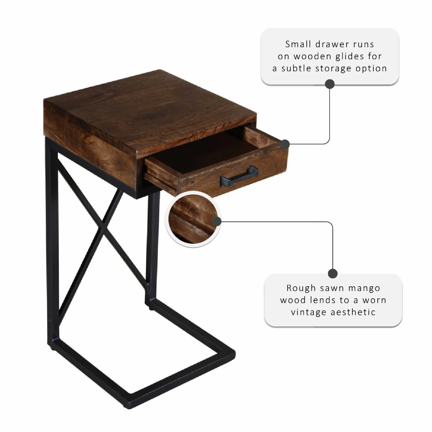 - Rough sawn mango wood lends to a vintage aesthetic