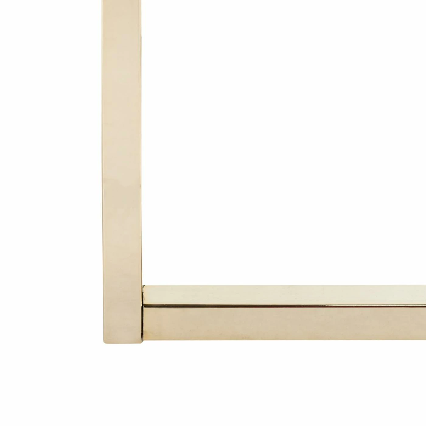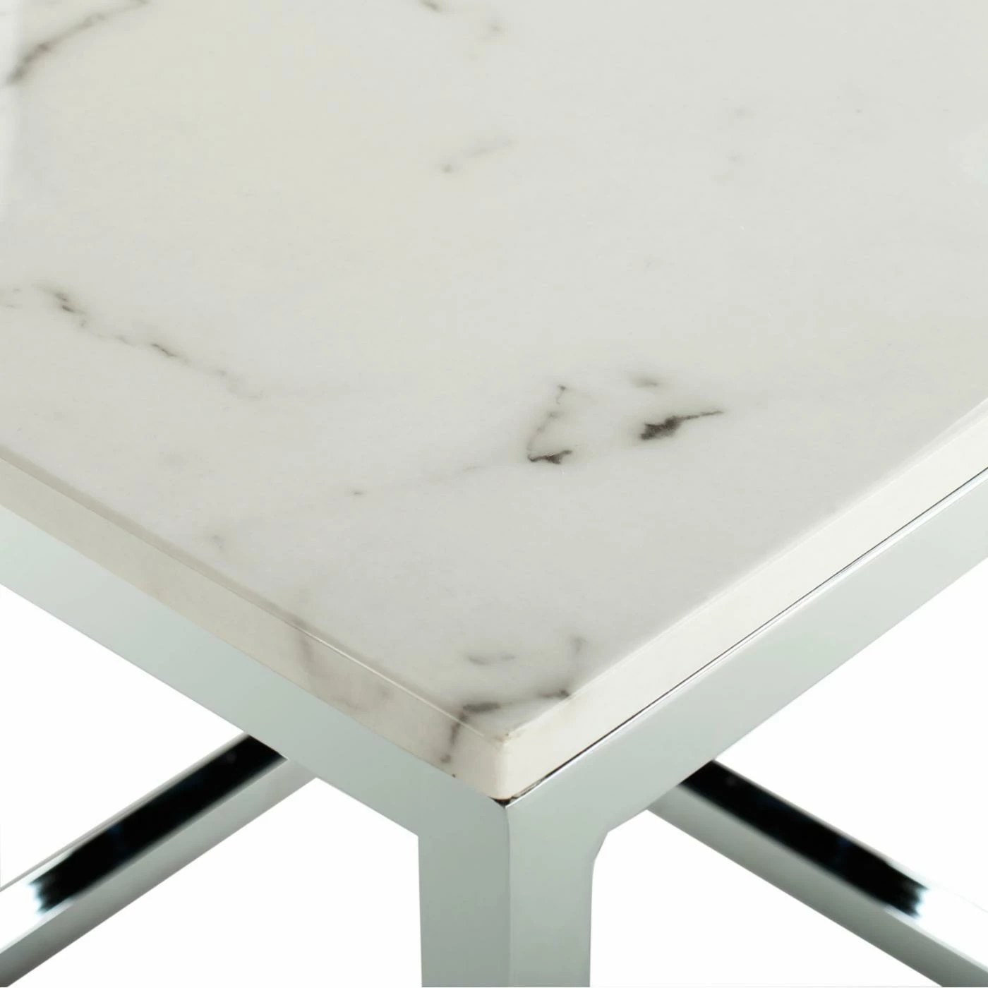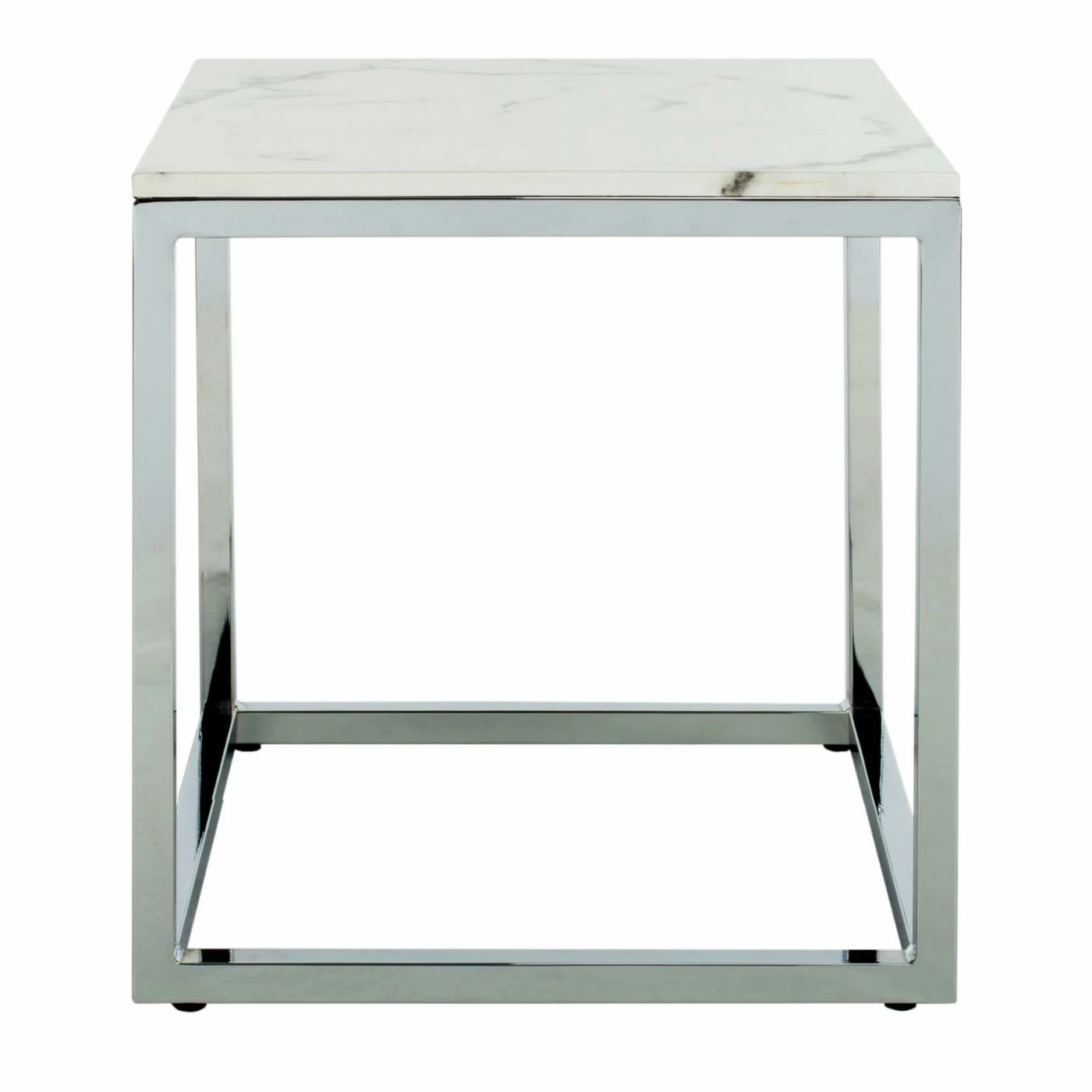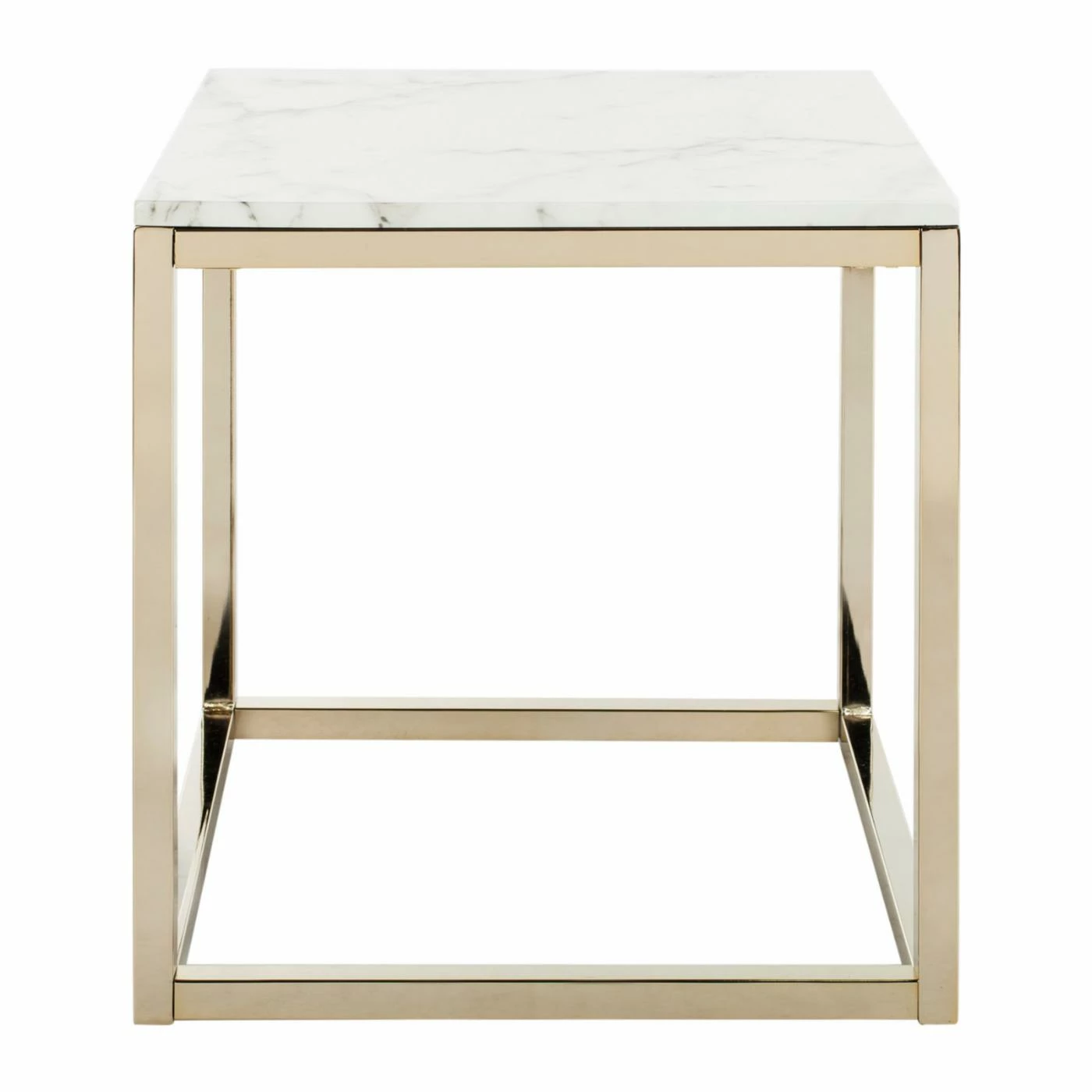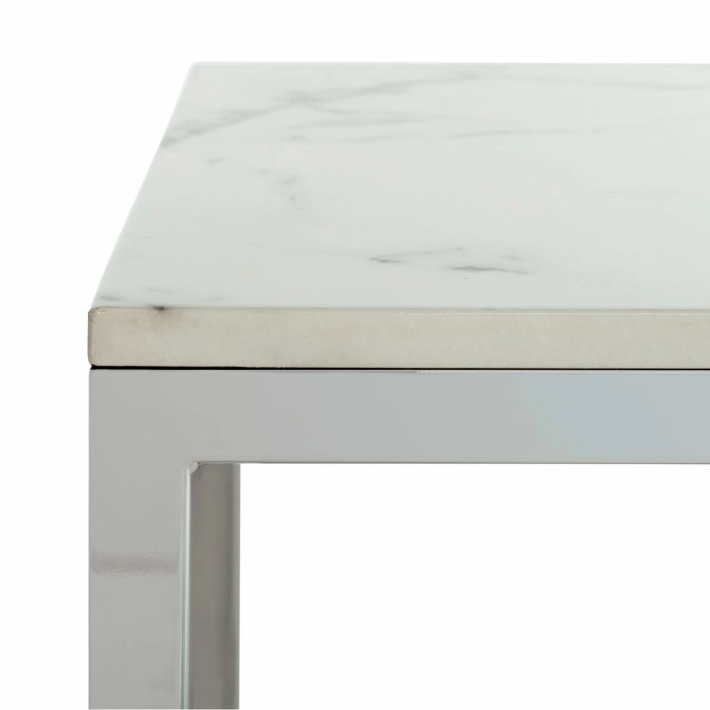 The Safavieh Bethany Square End Table features a white faux marble top. It’s supported by a boxy, openwork metal frame with a sleek metallic finish. The clean lines and sharp angles give this table a contemporary vibe, and it also has an air of elegance. This table is an excellent choice for complementing glam decor