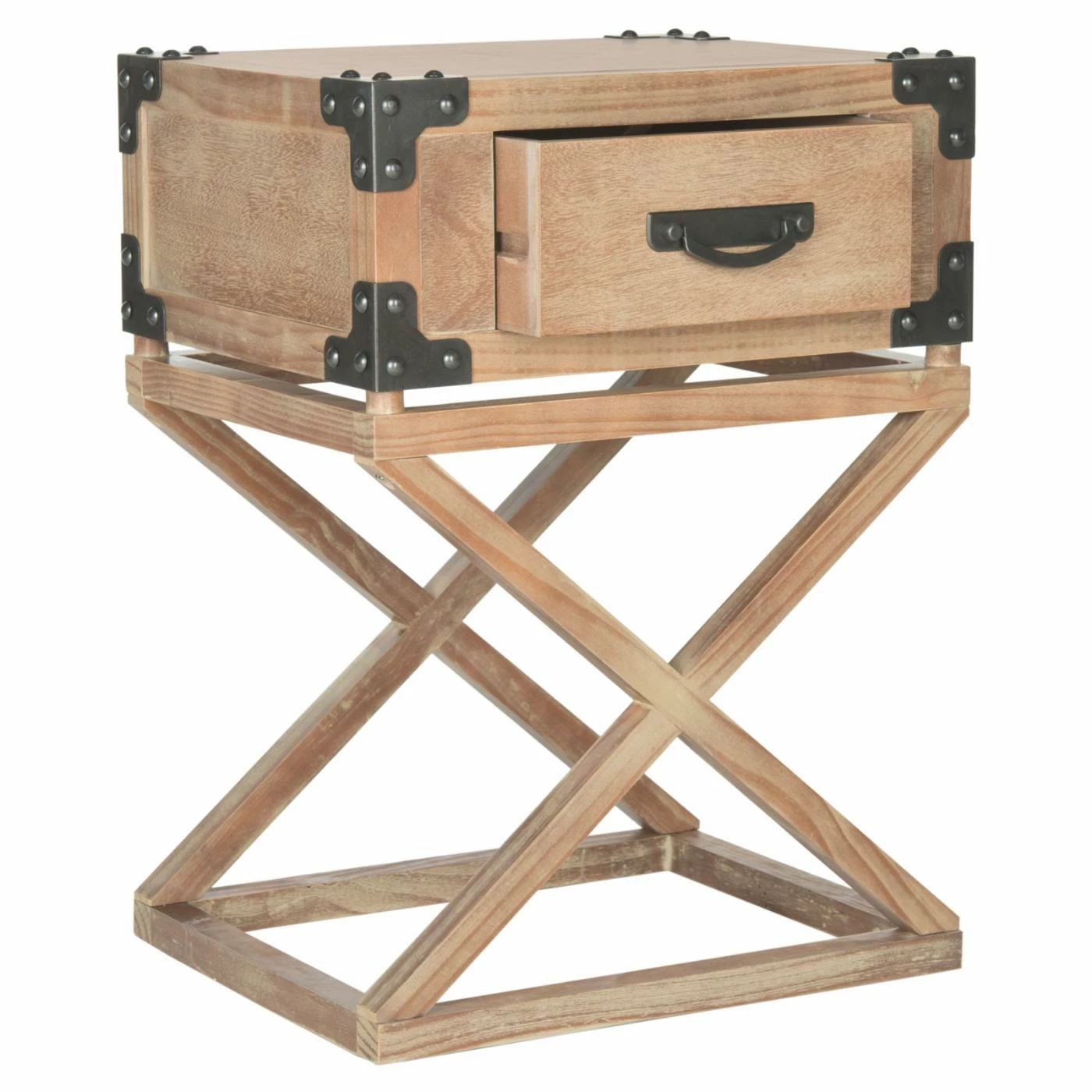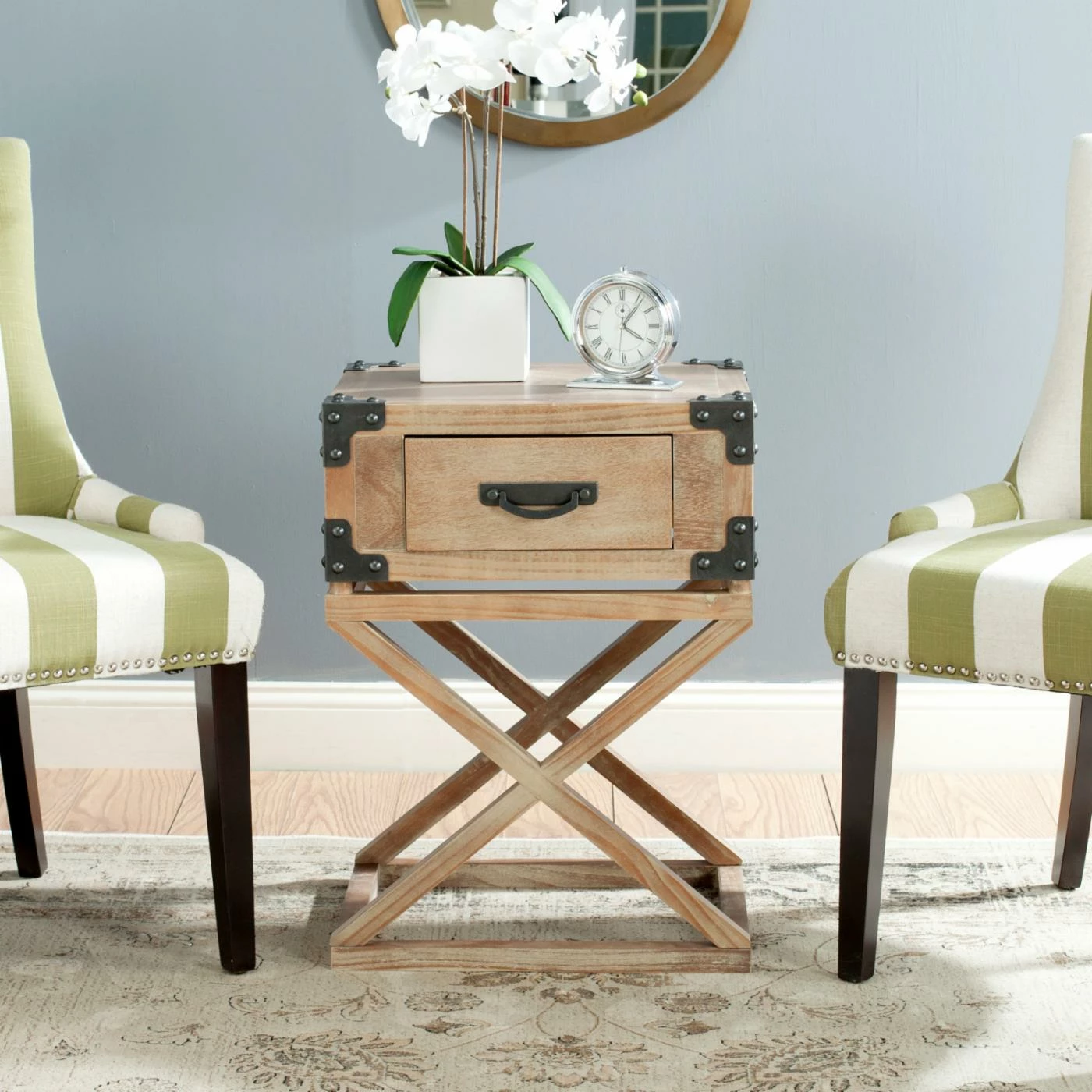 Iron steamer trunk corner caps and a handle-style drawer pull give the Safavieh Dunstan Storage Side Table antique, industrial appeal. The table is fabricated out of a mix of solid pine and engineered wood to ensure durability while keeping the weight of the piece light. Use the side table on its own between two chairs or a recliner, or place one at either end of your sofa or loveseat to complete your seating area.
