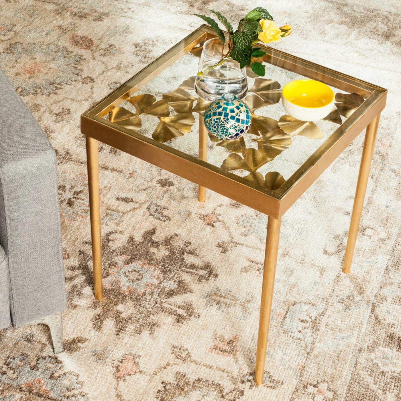 Reminiscent of a table crafted by Italian goldsmiths for the Tuscan villa of a prince, the Safavieh Otto Ginkgo Leaf Side Table brings natural beauty to life in the most elegant of ways. The clear, tempered glass top is embellished with three-dimensional iron ginkgo leaves embellished with exquisite gold leaf. A simple, smooth square iron frame and slender, tapered cylindrical legs finish the piece.