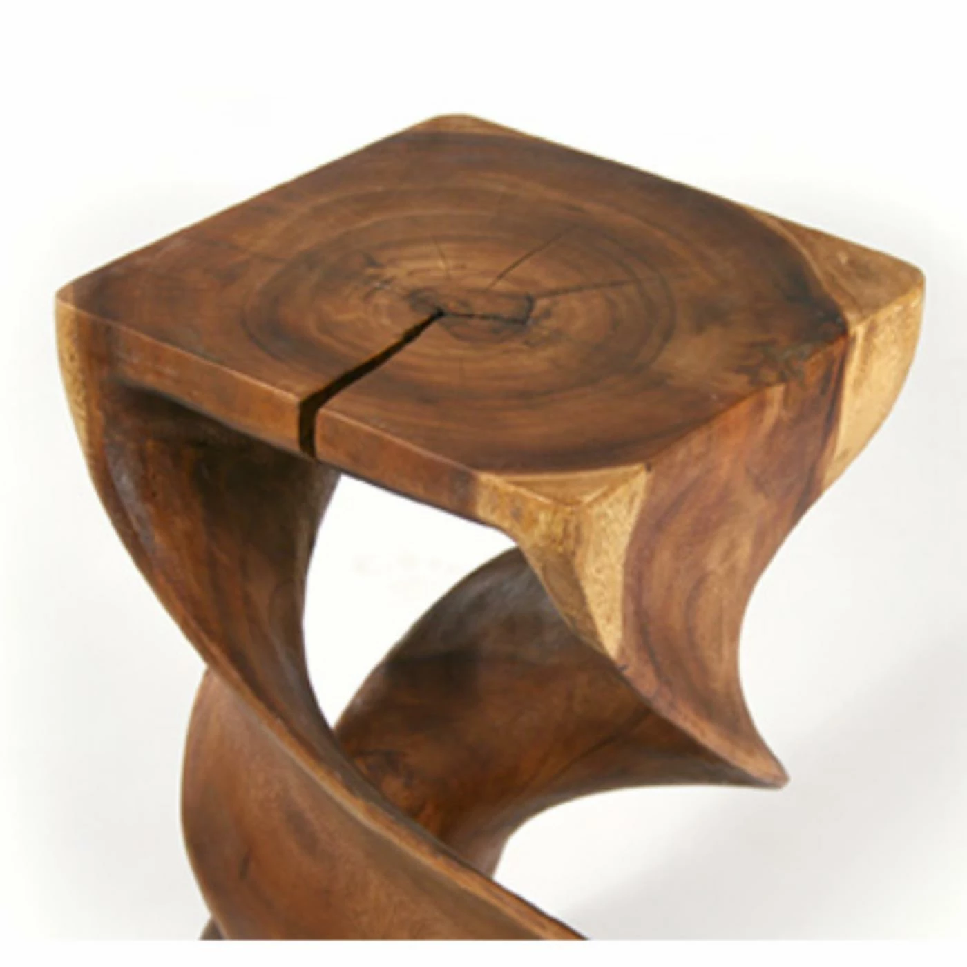 Gorgeous and attention-grabbing, the Strata Furniture Double Twist End Table is hand-carved from a single block of monkey pod wood to deliver a truly unique look to your living room. Perfect as an end table, stool, or display stand, this piece features a double twist design, with a Livos black walnut oil finish to bring out the natural beauty of the wood. Suitable for both conventional and rustic-themed rooms, this end table will give you years of beauty.