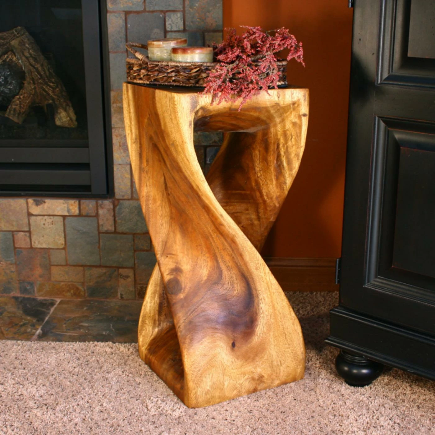 Breezy sophistication is easy to achieve with the Strata Furniture Medium Accent Table. This accent table fits neatly into a small space, or place two or more together for use as a distinctive coffee table! Skilled craftsmen carve kiln-dried blocks of monkey pod wood to create the unique twisted pedestals and the square top and base that define this accent table. The finish is an absolutely exquisite translucent walnut, showcasing the “glow” monkey pod wood is known for. Finish oils are non-toxic and are applied by hand.