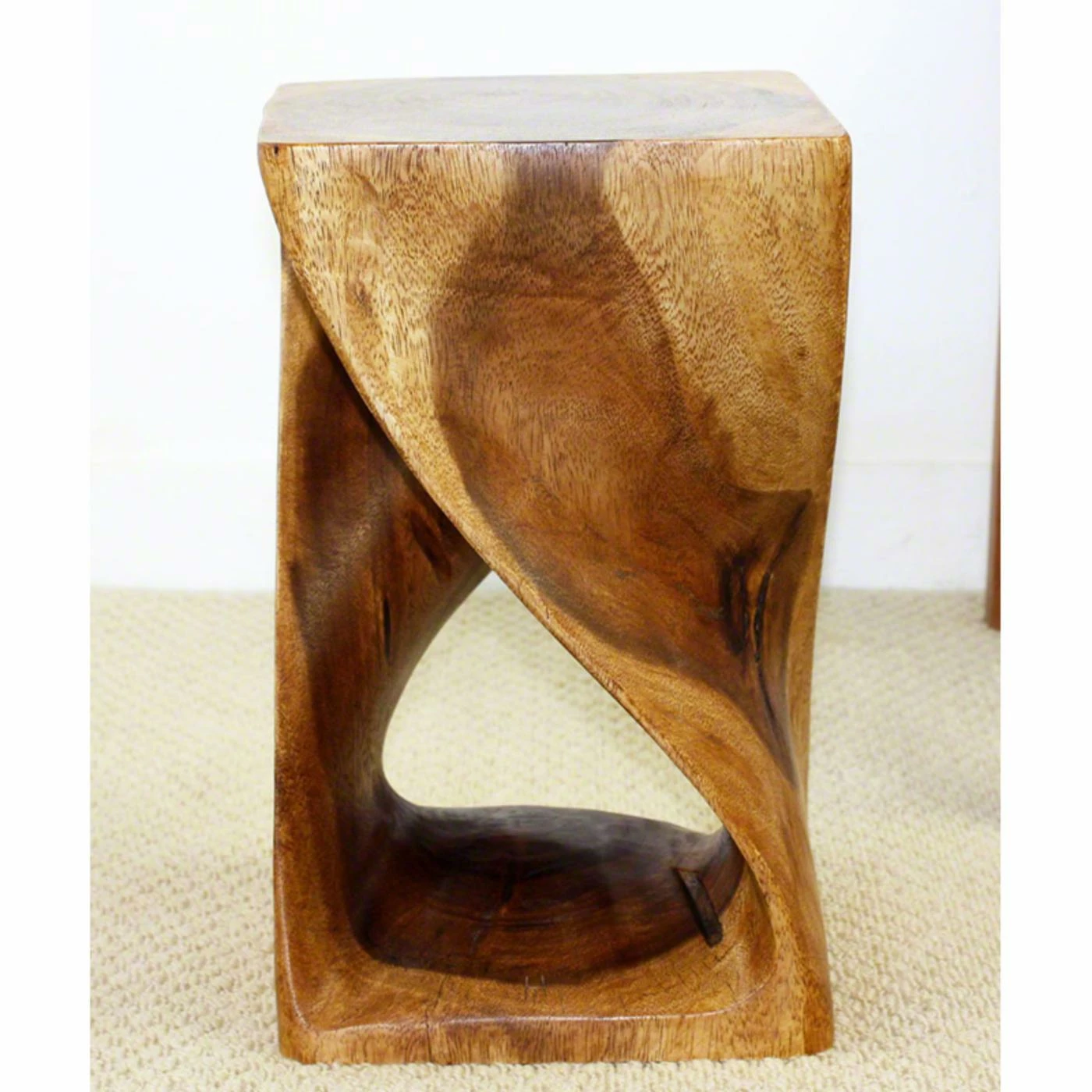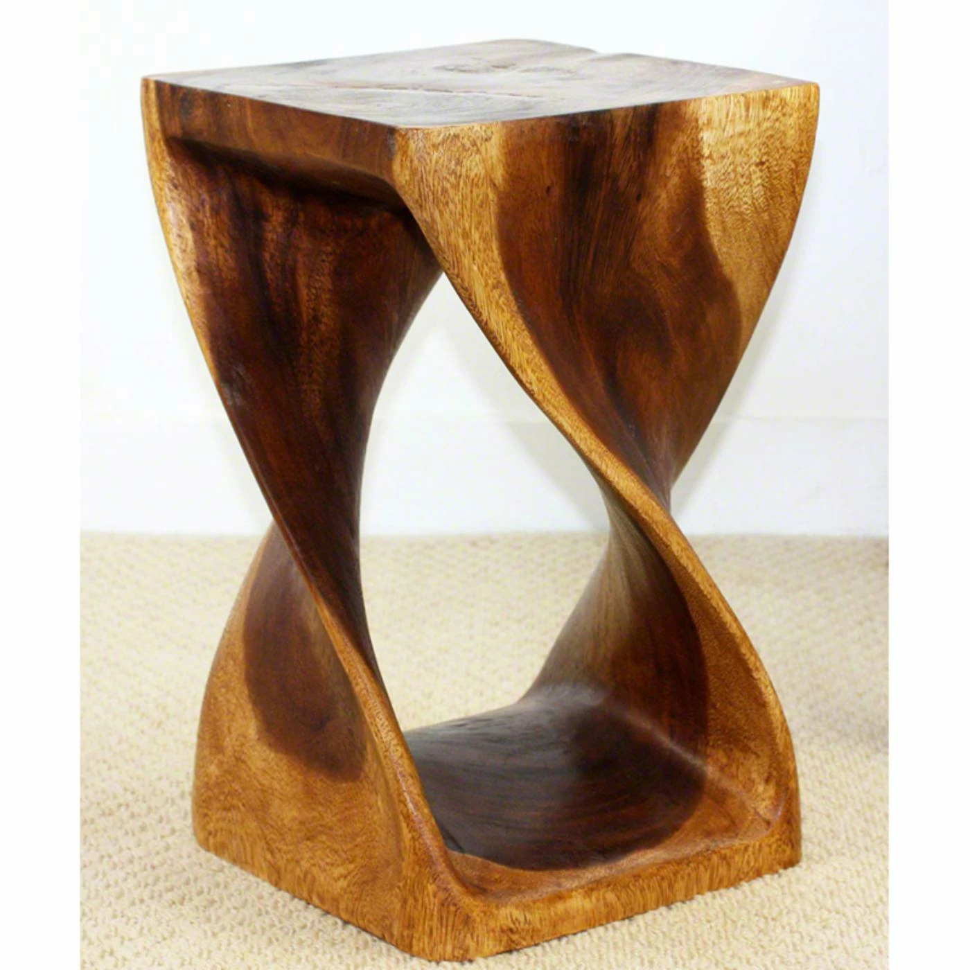 Good luck finding a decorative accent to place atop the Strata Furniture Twist Wood End Table that is as attractive as the table itself! This remarkable feat of woodwork is hand carved from sustainable monkey pod wood and is completely eco-friendly. Even its oil finish is food-safe! The bold, statement-making design features a square top with natural distressing and a contemporary foundation of two twisting pedestals. Use it as an end table or as a stylish stool! It will fit right in at the kitchen, living room, or master bedroom.