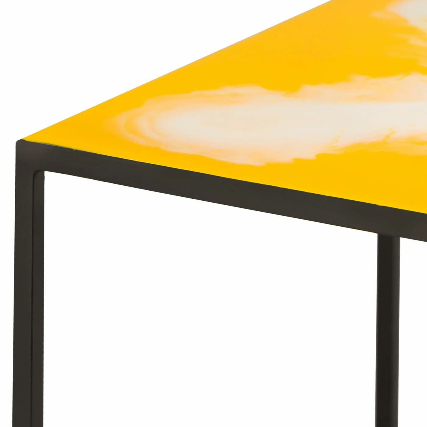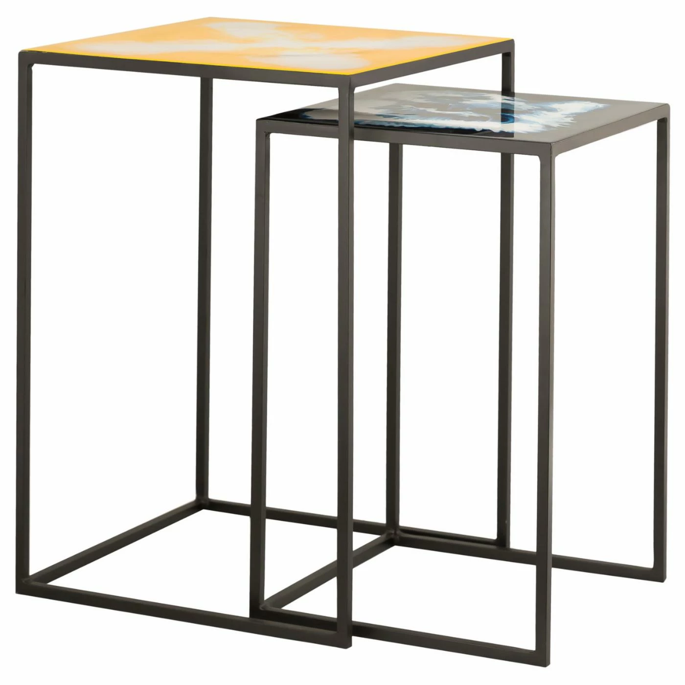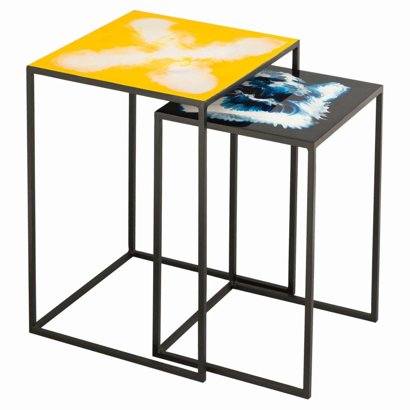 Expand your living roomβs usable space with the TOV Furniture Enamel Nesting Side Tables. A matching large and small cubic table are included in this set. Each table is supported by a cubed iron base, finished in matte black. The tops are rendered from thick enamel and feature a swirled, splashed design: white on yellow on the larger table and blue-white on black for the smaller. Bunch the tables together or display them apart as desired.