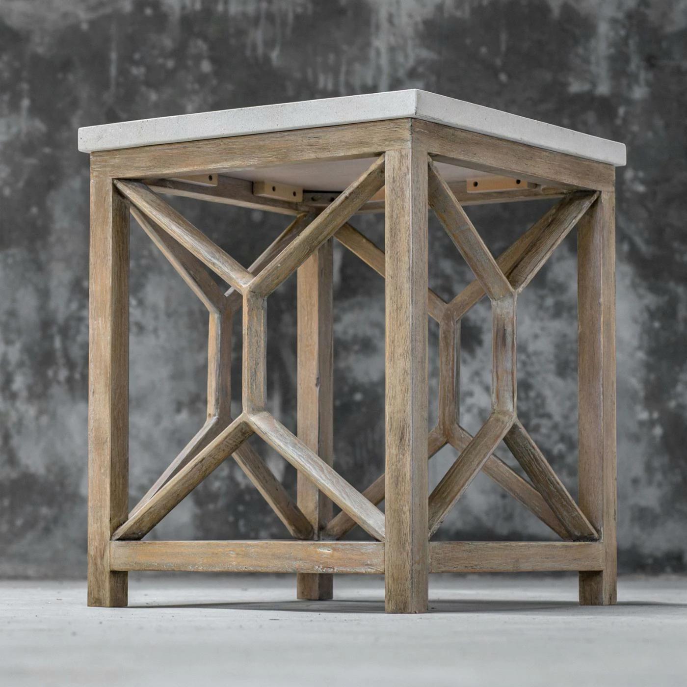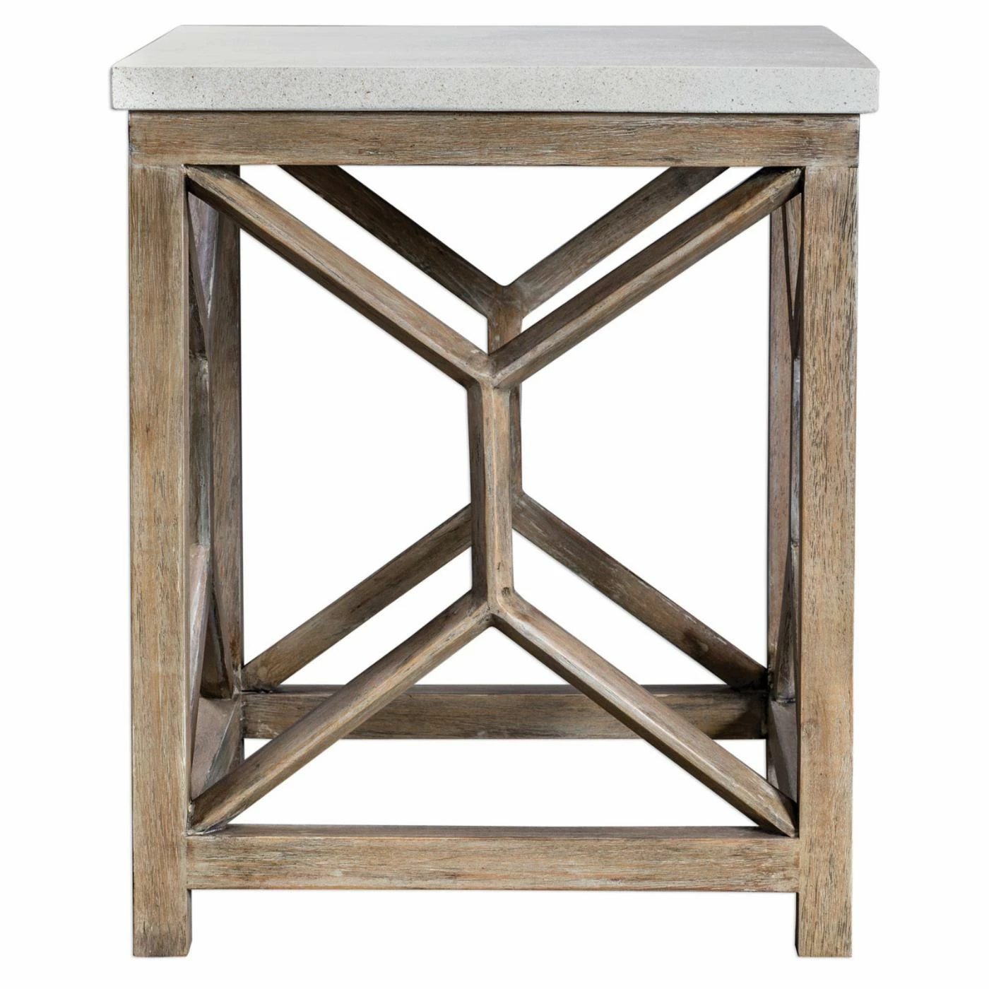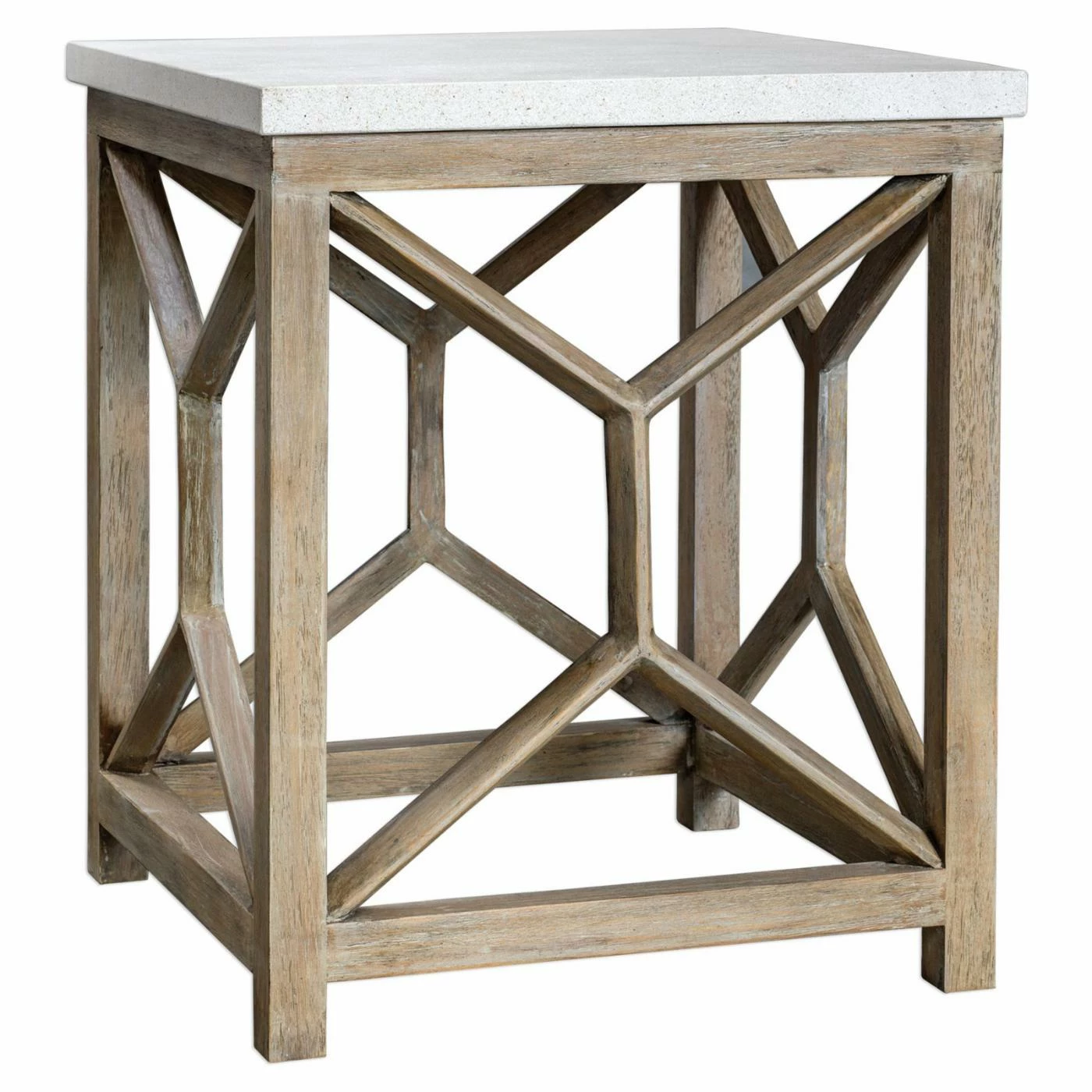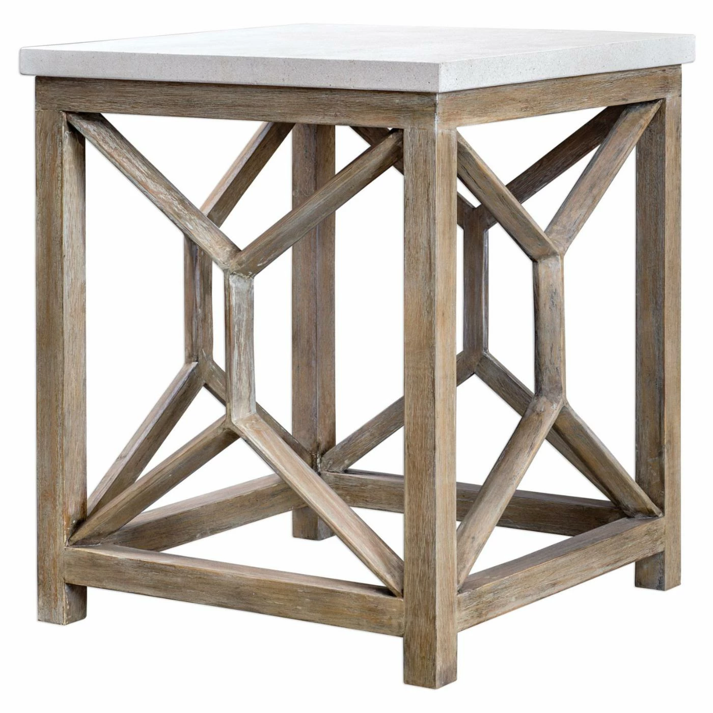 A sleek slab of white limestone forms a luxurious top to the Uttermost Catali Stone End Table. This end table boasts a highly durable java wood and compressed wood frame. The light oatmeal finish accents the wood with gently weathered charm. The base is accented by eye-catching geometric detailing.