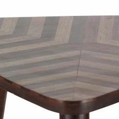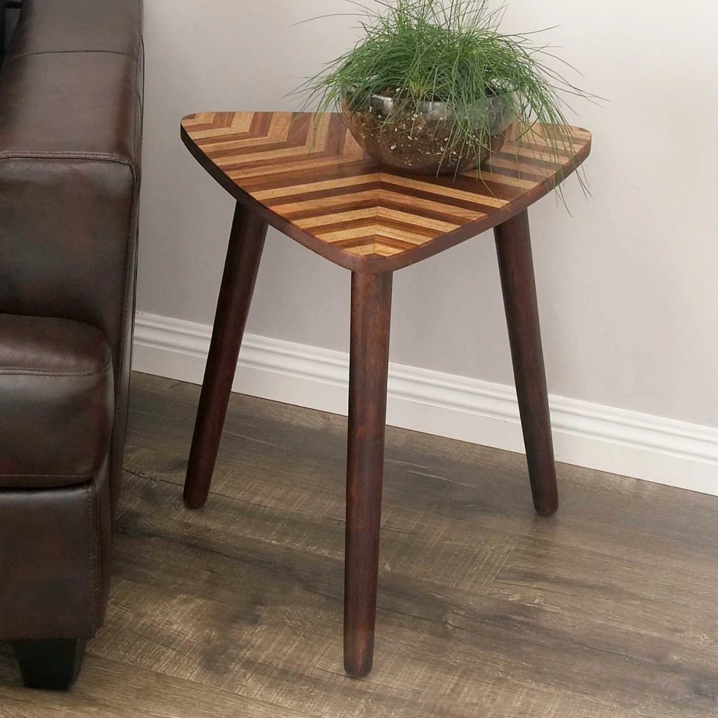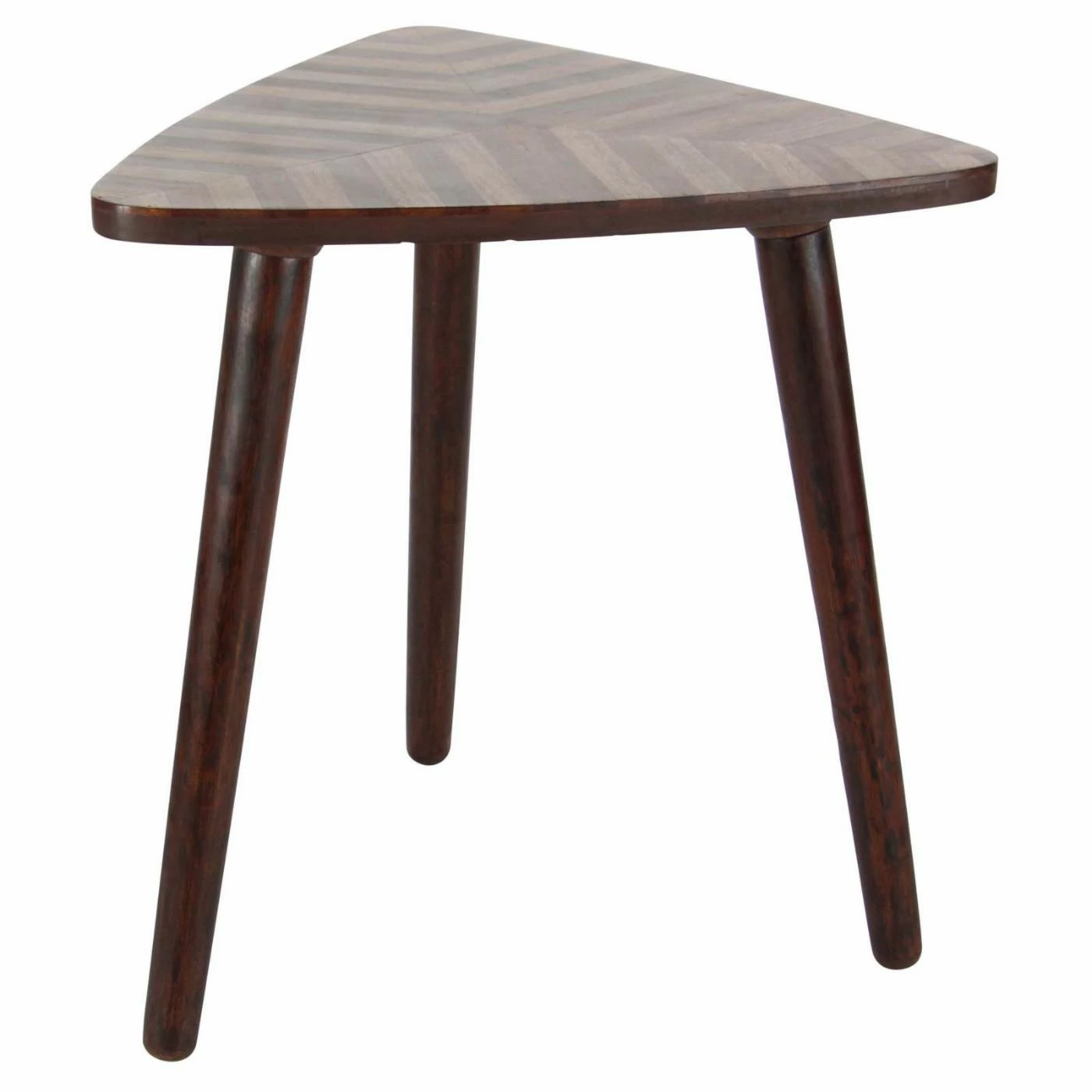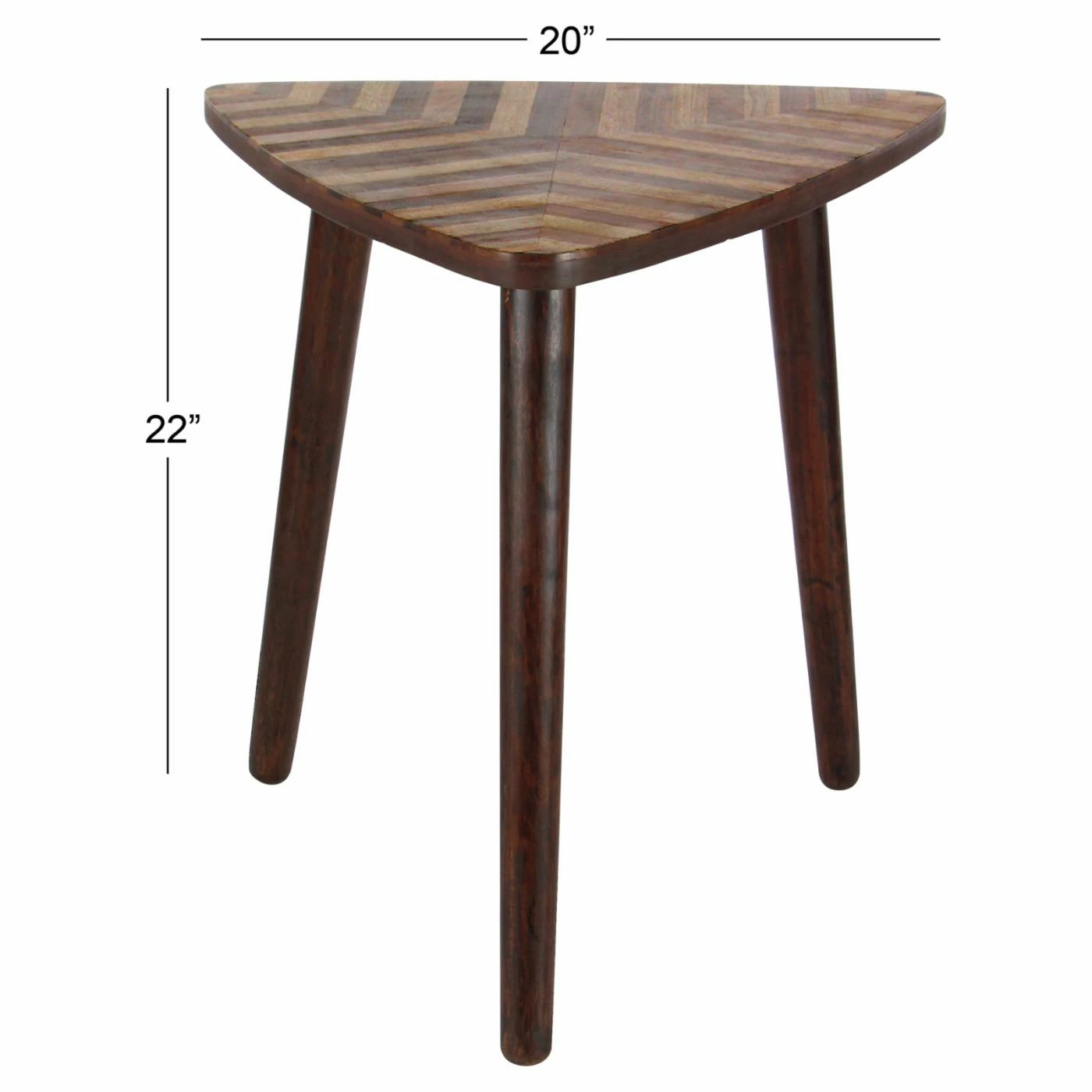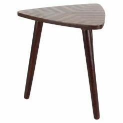 Tuck the DecMode Triangular Chevron End Table into a corner, or use it to add visual drama to any setting. This mango wood end table features a triangle top with coordinating chevron detail. It stands on a tripod wood dowel leg base and is graced by a lightly distressed dark brown finish.