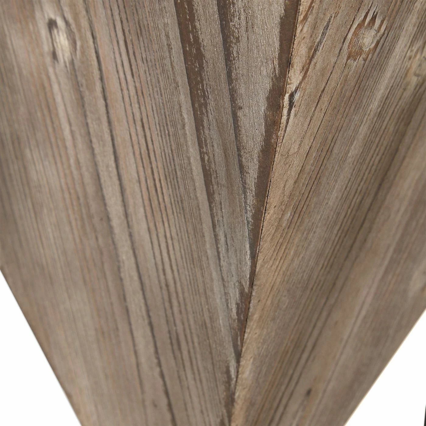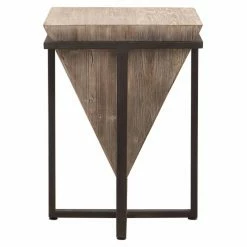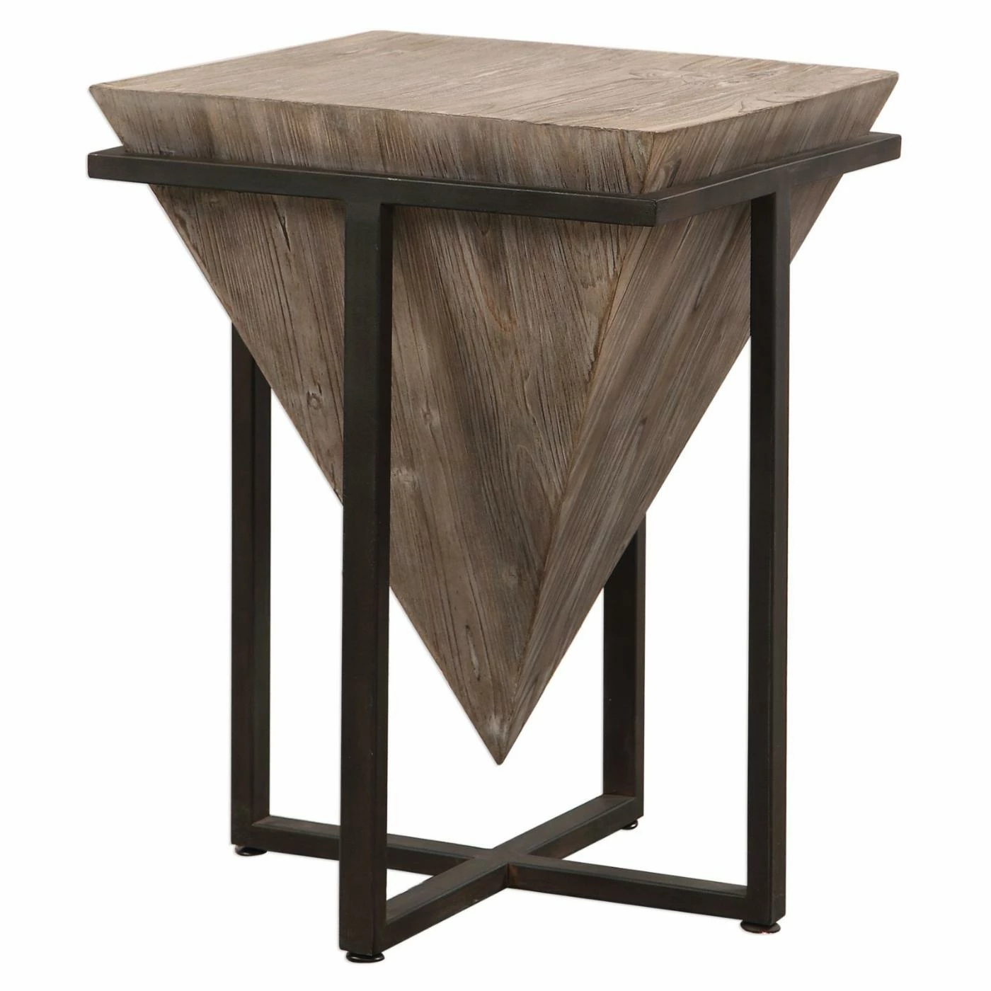 Blending contemporary style with rustic elements, the Uttermost Bertrand Wood Accent Table boasts rugged fir and compressed wood construction. The pyramid-styled design is suspended by a sturdy iron frame. Weathered black finishing lets the metal complement the gray-washed wood.